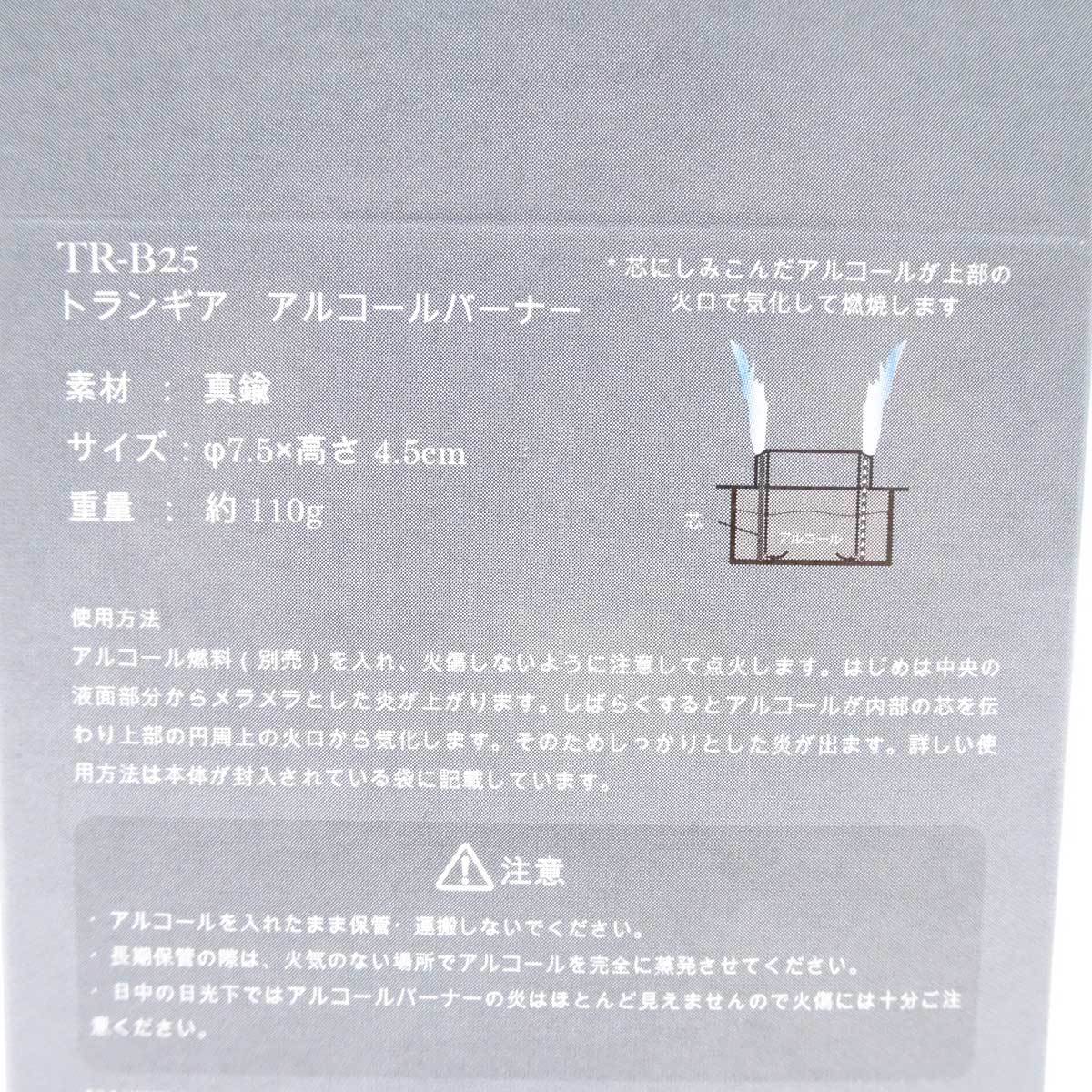 ※商品は画像にあるものがすべてとなります。 【仕様】 ブランド:トランギア タイプ:アルコールバーナー スピリットバーナー [ウィンドシールドゴトク(TR-281)付] 型番:TR-B25 重量:110g 収納時サイズ:径7.5×高さ4.5cm 材質:真鍮 |