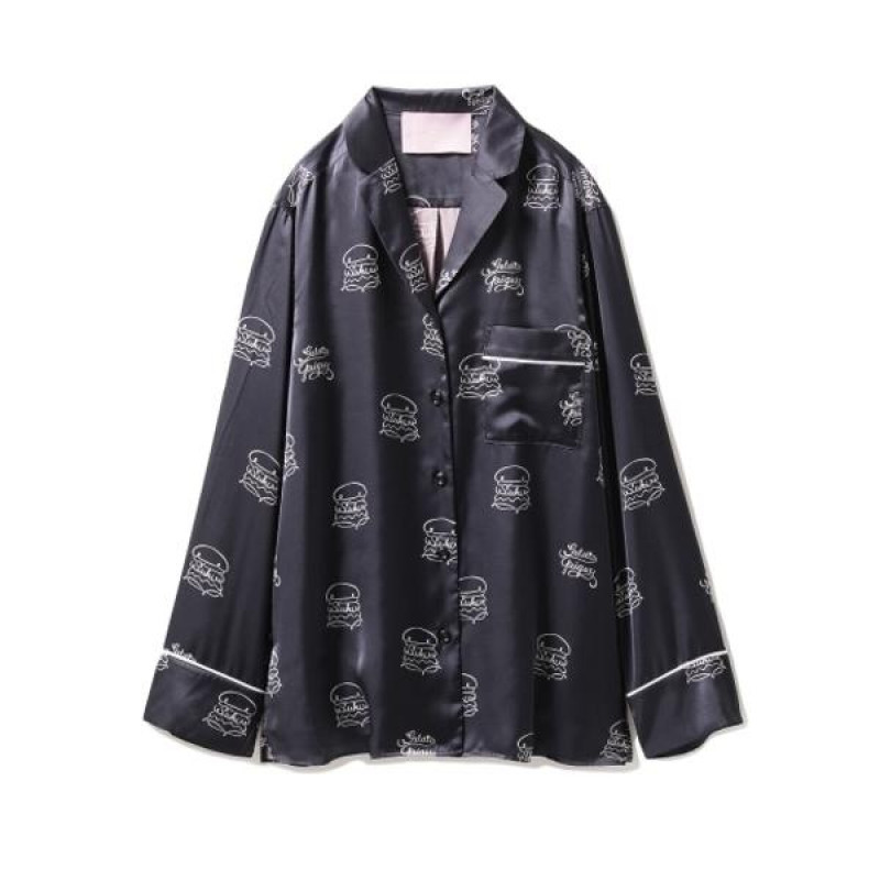 艶やかなサテン素材に、彼女の大好きなハンバーガーモチーフを描いた、おしゃれなシャツパジャマで、クリスマスシーズンは、気持ちもHAPPYに