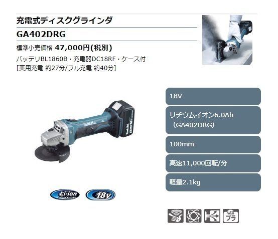 | 標準付属品 | 研削砥石36P・ロックナットレンチ20(782401-1) 充電器(DC18RF)・バッテリ(BL1860B)・ケース |