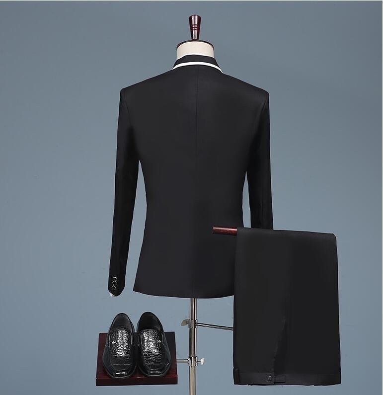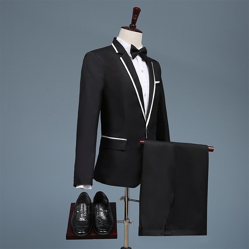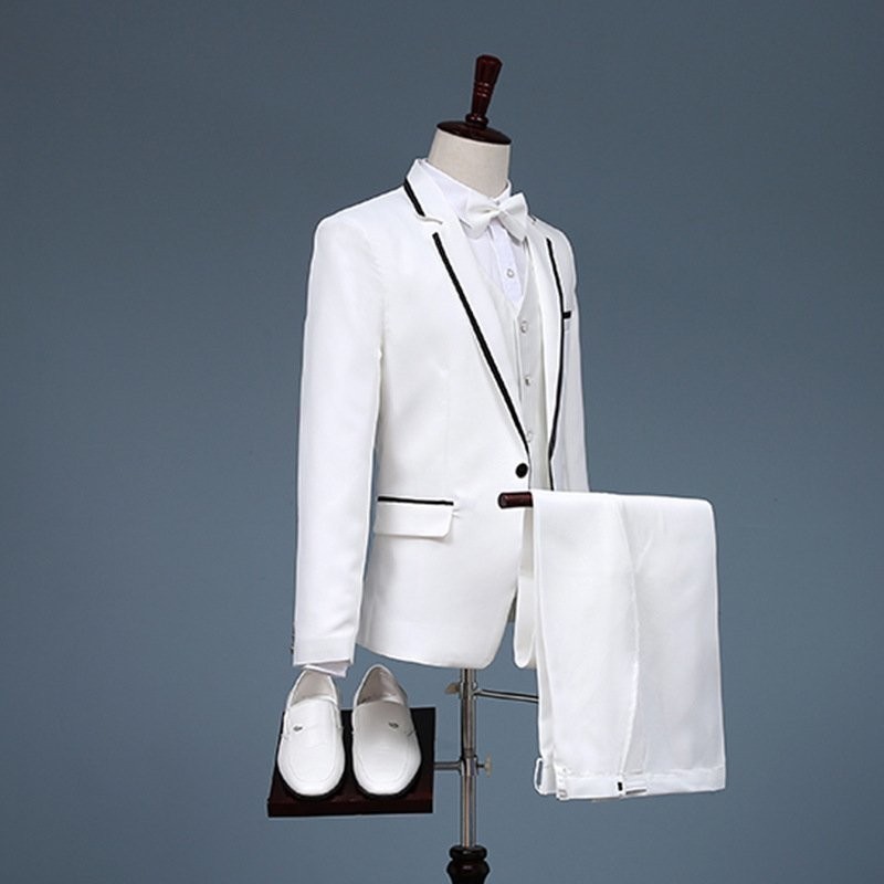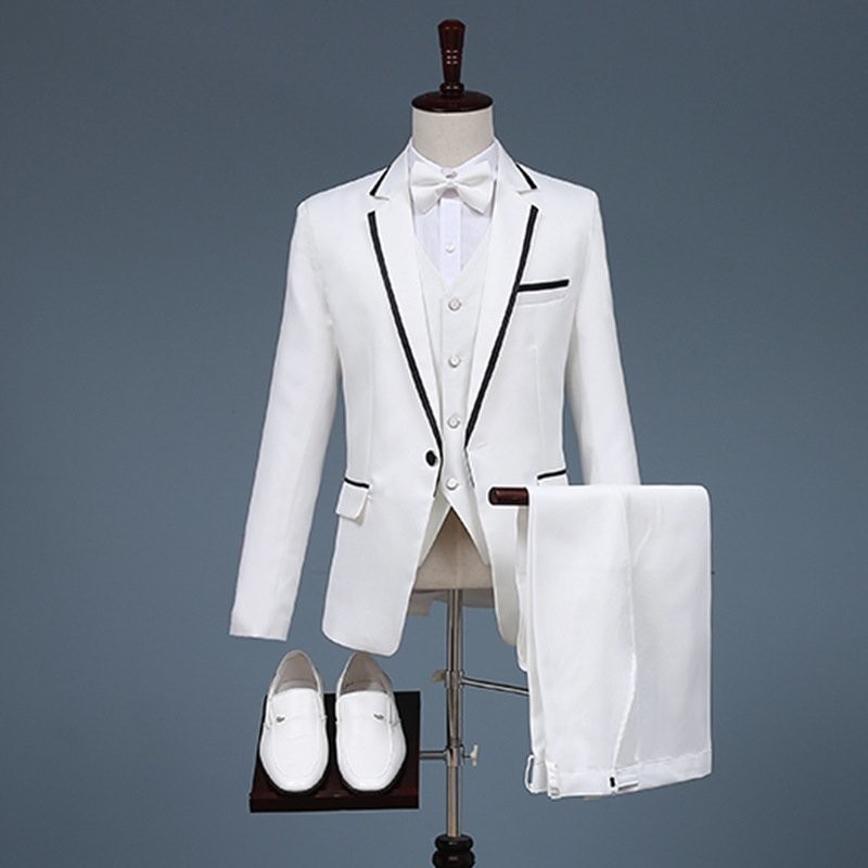 2点セット ホワイト(白)+黒ライン メンズ スーツセット タキシード上着 ズボン演奏会舞台衣装☆2色/S M L-2XLサイズ選択/1点