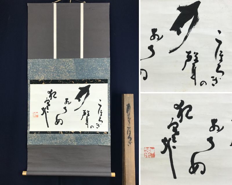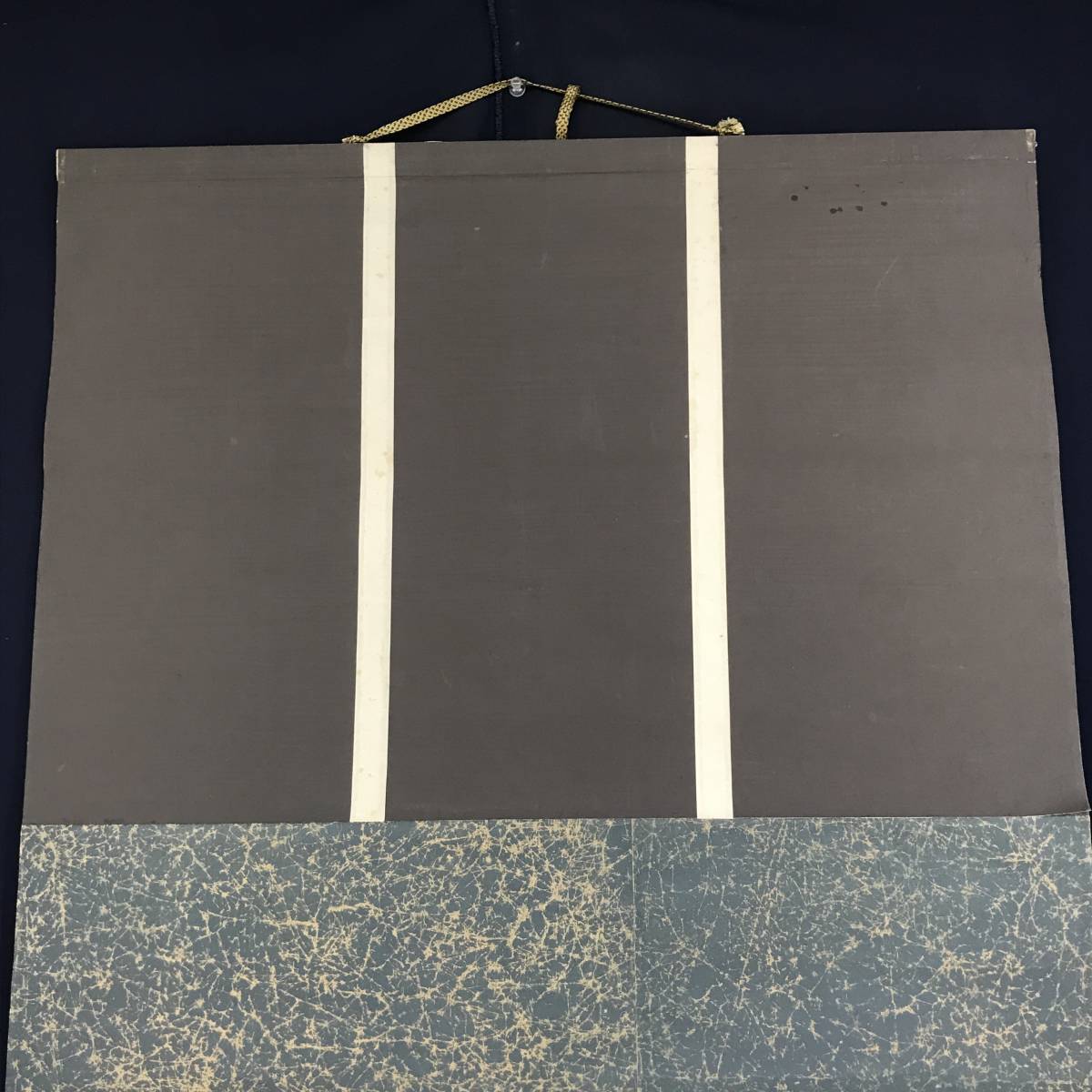 【作品状態】 本紙は紙本肉筆です。  本紙は薄汚れ、多数の糊シミあります。表装はモミ紙表装で概ね良好です。