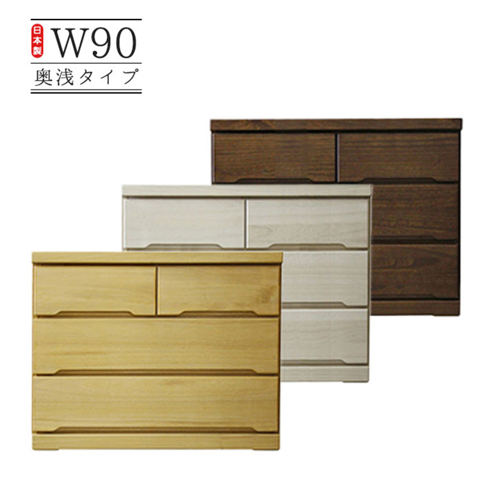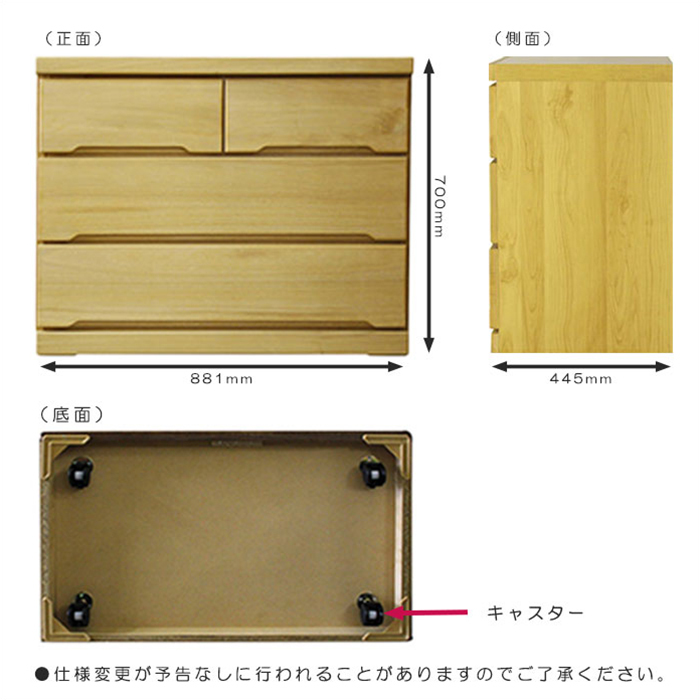 特  徴幅88cm桐材を使った、国産ローチェストです。引き出しは頑丈な箱組み。取り付け式の隠しキャスター付きです。