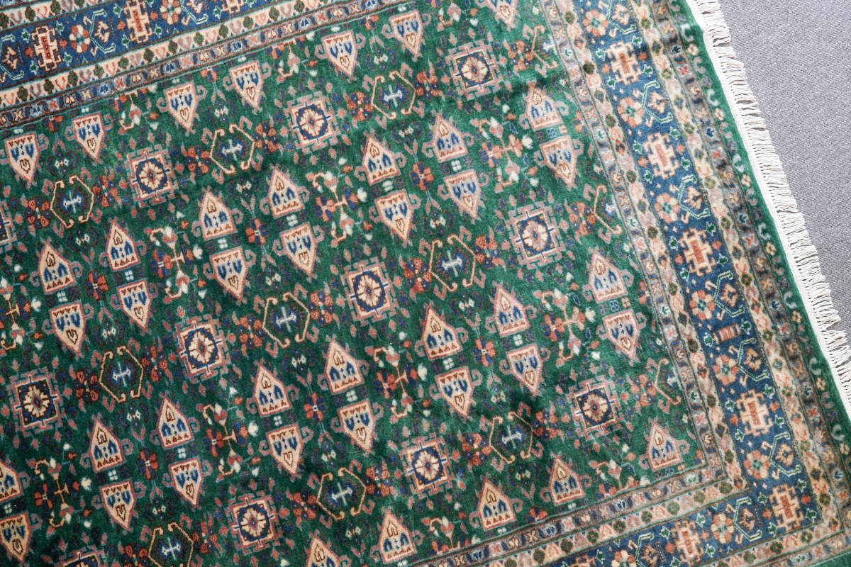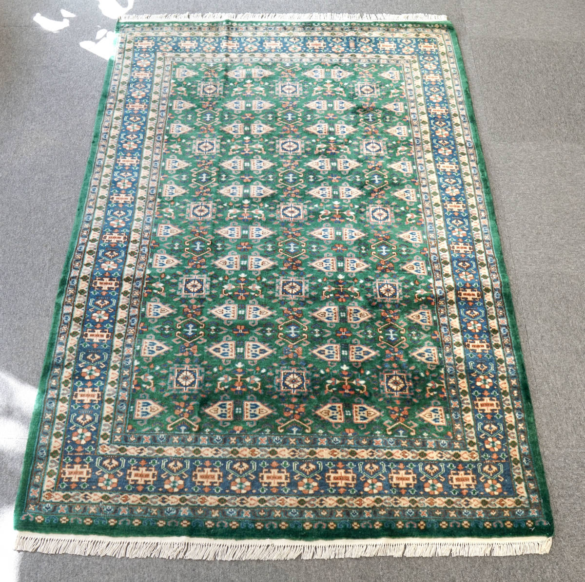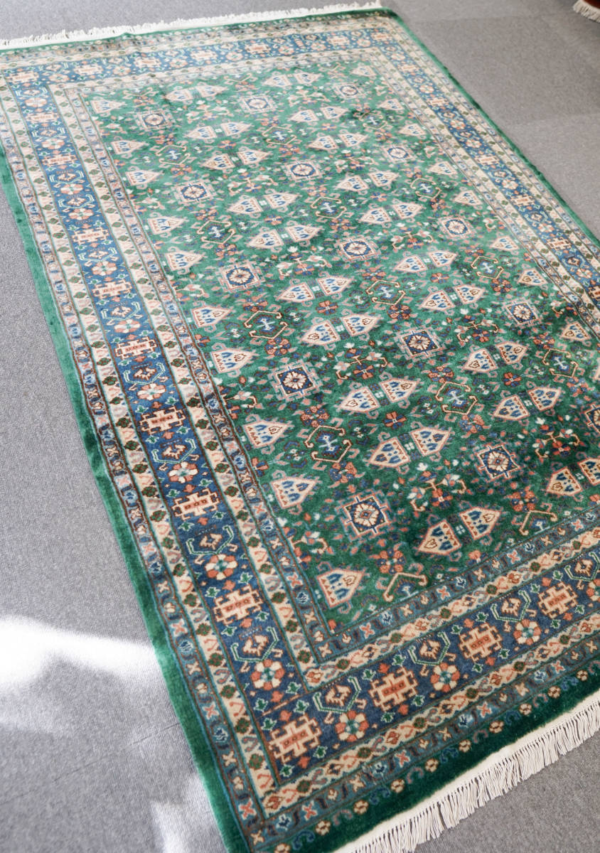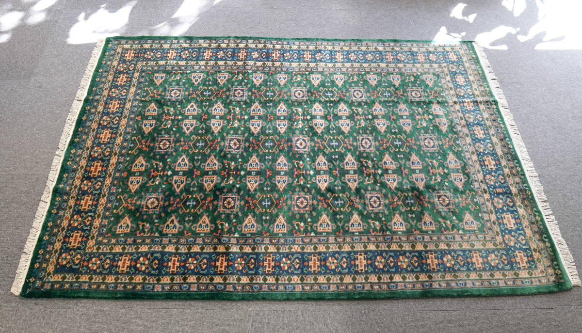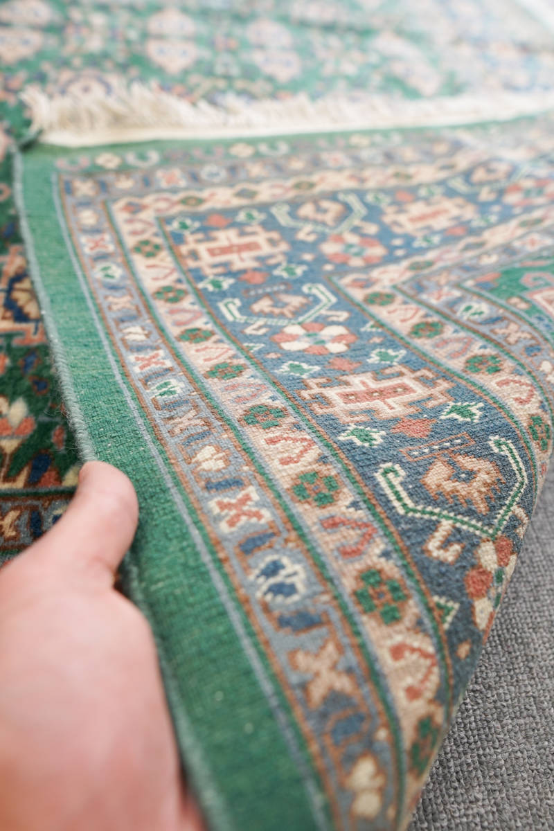 ニュージーランド産の上質なウールを使用し、信頼できる熟練した職人が手織りしたパキスタン絨毯です。ニュージーランド産のウールはタンパク質をたくさん含んでいるためハリ、艶に富むのが特徴です。肌触りはなめらかで柔らかく、弾力のあるパイル地が底冷えを防ぎ足元を快適にします。