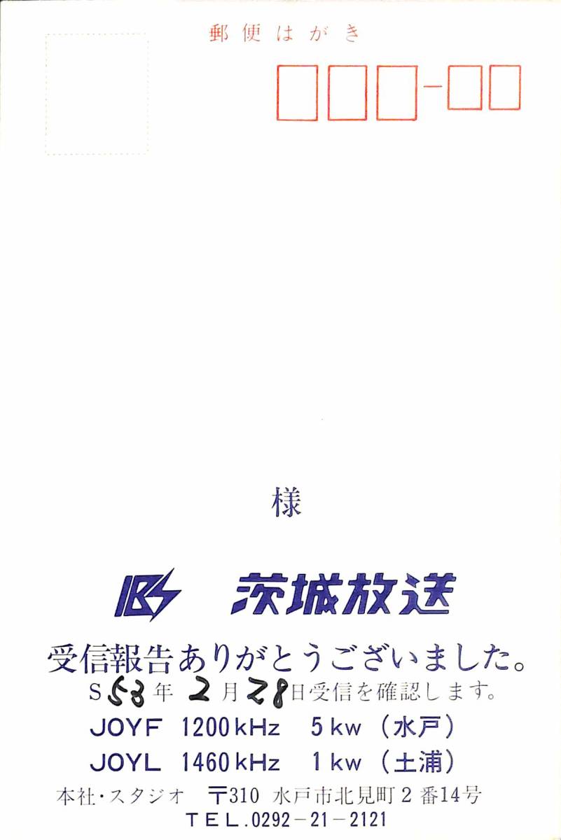 【商品名】・・・JOYF(★IBS・茨城放送)のベリカード。 【コメント】・・・昭和30年代~50年代のベリカードは大変貴重です! 【国名・地名】・・・日本★茨城県。 【受信データ】・・・1978年(★昭和53年)2月28日・MW1200KHZを受信。 【記載事項】・・・受信日のみ記載。【状態】・・・シワ、汚れ、シミ、焼け、色あせ等があります。 ■カードの状態は★画像を参考に判断して下さい。 ■この機会にぜひこのベリカードを貴方のBCLコレクションに加えて下さい! | |