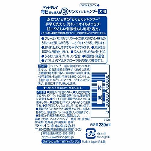 本体サイズ (幅X奥行X高さ) :6.5×6.5×19.1cm・本体重量:0.308kg・原産国:日本商品紹介 クリーミィな泡がデリケートな愛犬の皮ふ・被毛のうるおいを残しながら汚れ・ニオイをすっきり洗い流す。泡切れもよく、すすぎも手早くすむ。洗浄成分の100%が植物生まれ。ふんわりなめらか仕上げ。うるおい成分グリセリン配合。弱酸性・無着色。うるおいマイルドフローラルの香り(微香性)。 原材料・成分 水、洗浄剤、保湿剤、防腐剤、pH調整剤、香料