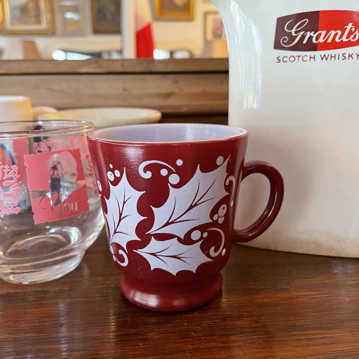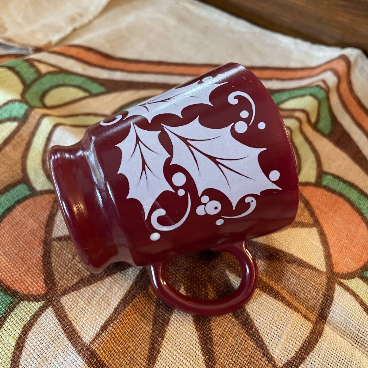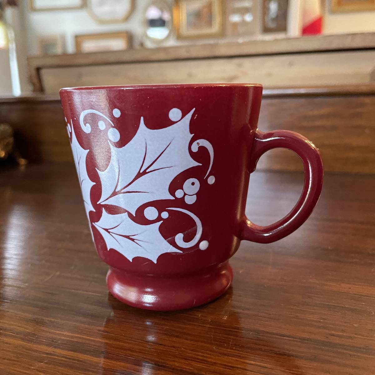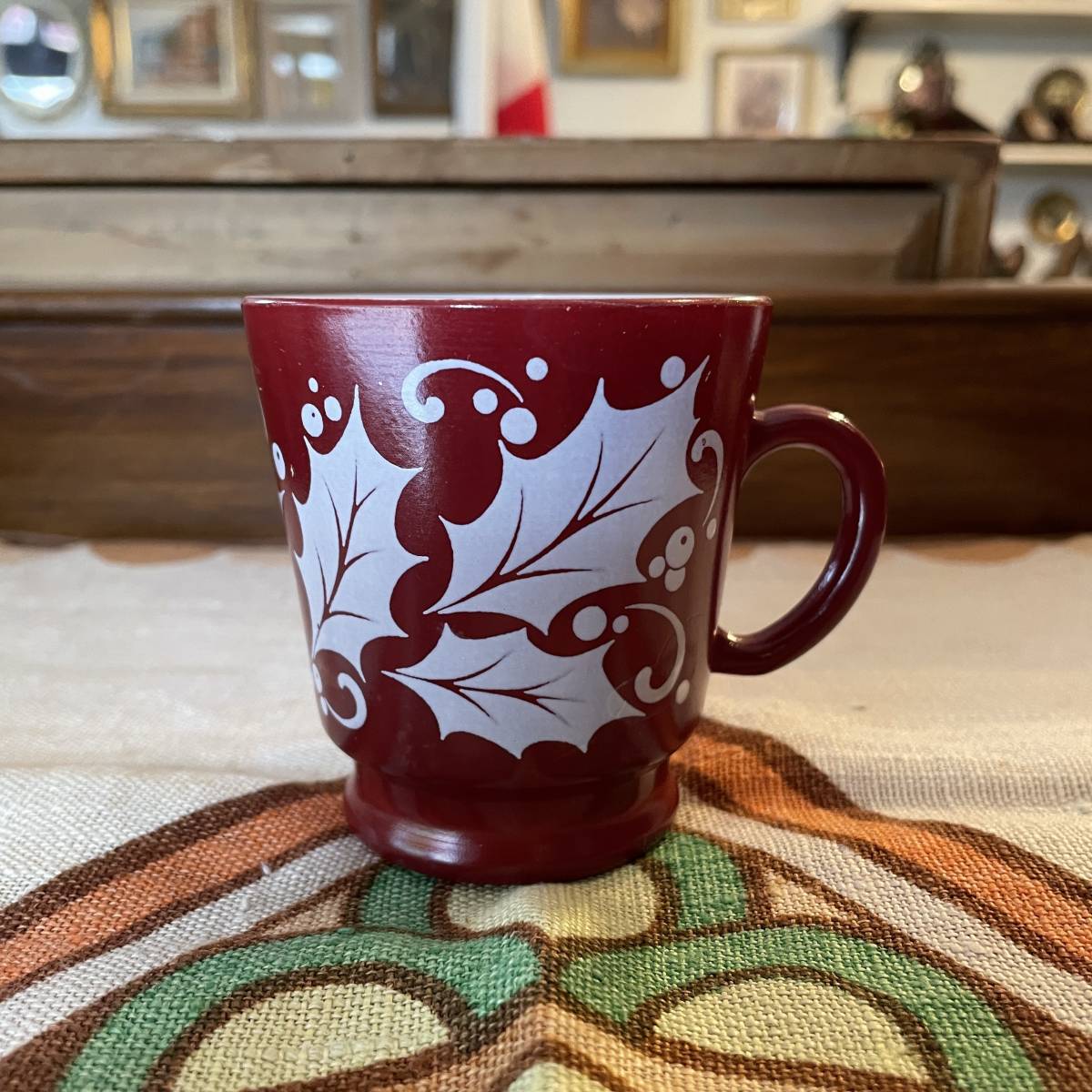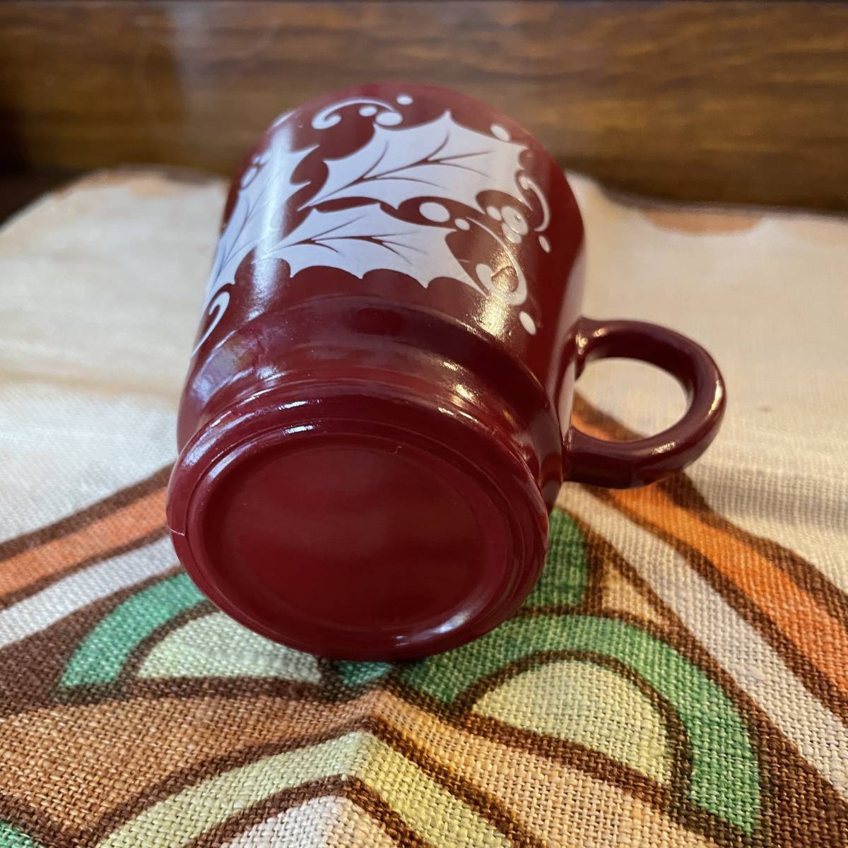 貴重!60's〜70's アメリカアンティーク葉の模様ミルクガラスのマグカップ USAヴィンテージ食器/北欧firekingパイレックス家具フェデラル
