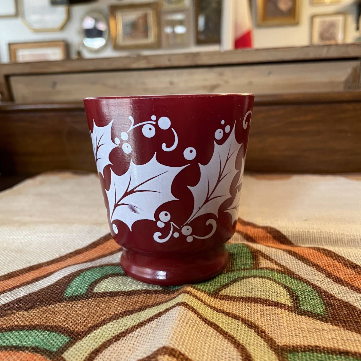 アメリカのアンティークショップで購入しました。 1960年代前後のヴィンテージ のミルクガラスマグカップになります。刻印がありませんが、おそらくフェデラル社のものではないかと思います。絵柄がお洒落でスタイルの良いマグになります。カントリー好きな方いかがでしょうか。全体高さ約8cm、口の直径約7cmあります。一般的なファイヤーキングのマグカップよりやや小ぶりなサイズ感です。状態はカケやひびなどなく良好な状態です。同じマグカップが幾つかがありますので、同等品の発送となります。神経質な方はお控え下さい。ヴィンテージ品、アンティーク品にご理解ある方、よろしくお願いします。
