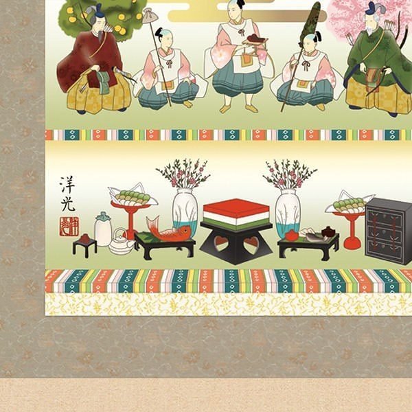 桃の節句にお掛けください。雄雛は束帯、女雛は十二単を着け、雲上にあるように描くのが多いが、時代や土地によって様々である。