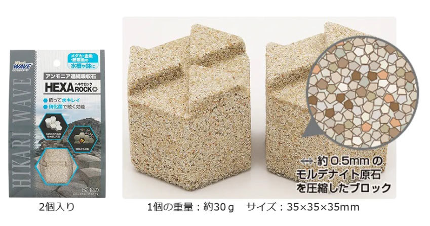 ヘキサロックは2個3個と自由に組み合わせてレイアウトを楽しめ、同時に魚に害のあるアンモニアや硫化水素を吸着し水を浄化する飾り石です。