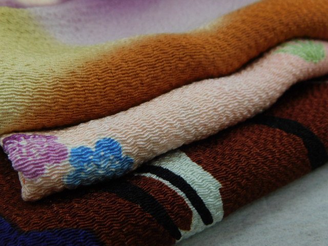 素敵な縮緬風呂敷3枚で、うち1枚は「コシノジュンコ」製です。(画像3枚目)