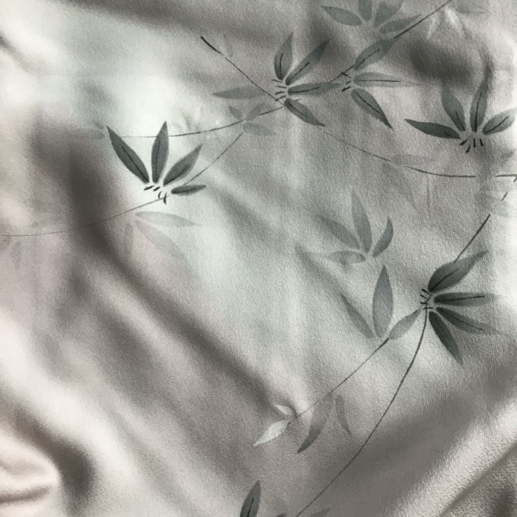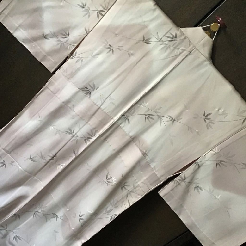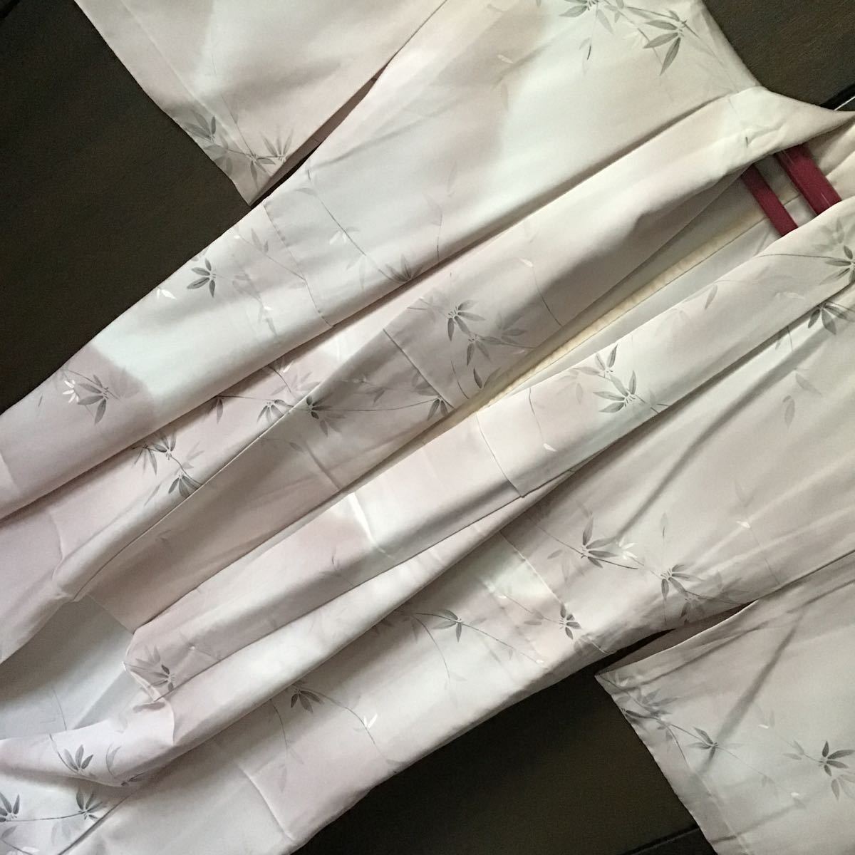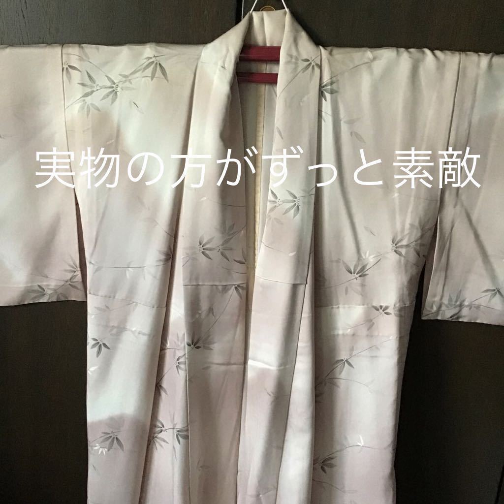 極薄サーモンピンクに極薄ベージュと超極薄グレーを混ぜたような基調のボカシ染めで、墨絵のようなおめでたい竹柄が濃淡あって涼しげで、大変素敵なお着物ですので、絶対気に入って頂けると思います♪