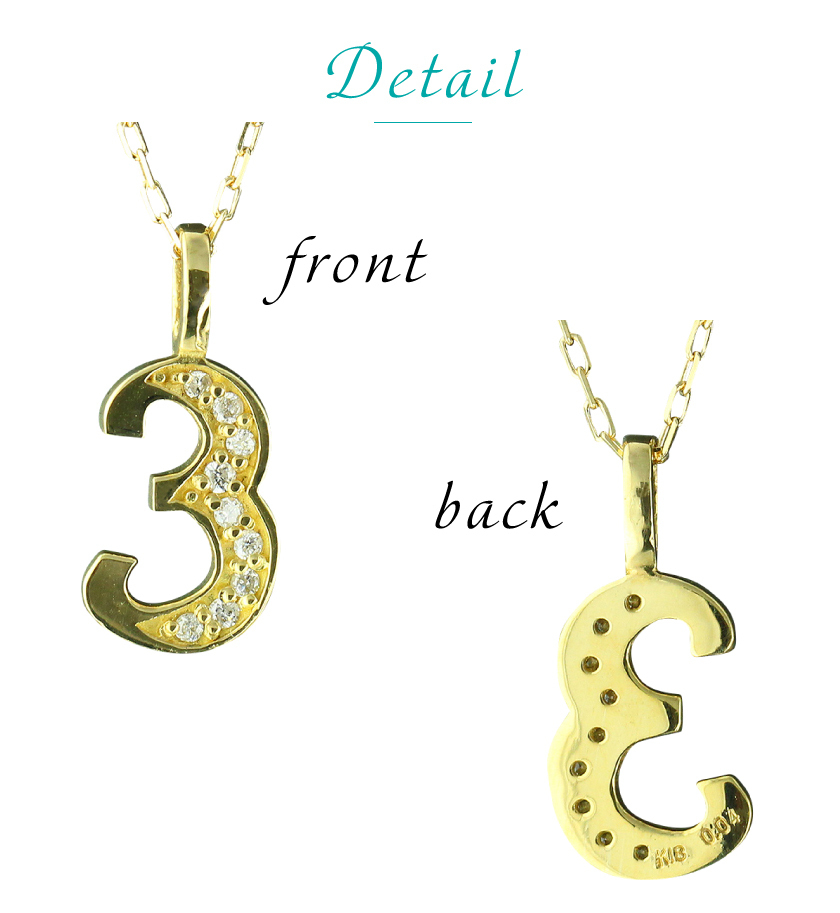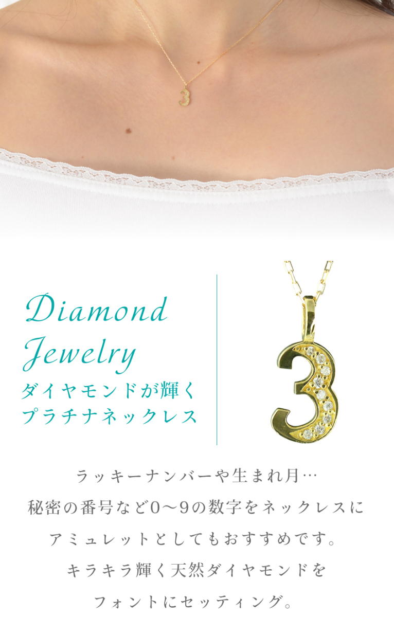 商品コードen908 発送は2週間ほどですナンバー 3ラッキーナンバーや生まれ月…秘密の番号など0~9の数字をネックレスにアミュレットとしてもおすすめです。キラキラ輝く天然ダイヤモンドをフォントにセッティング。あなたのお好きなナンバーを身につけてハッピーな毎日に。材質 K18ゴールド(ホワイト・ピンク・イエローよりお選びいただけます)宝石名 天然ダイヤモンド 0.04ct大きさ トップサイズ タテ 約10mm×ヨコ 約7.0mm ※厚み・約1.0mm ※バチカン内径・約1.0mm×3.0mmチェーン K18ゴールド/アズキチェーン(アジャスター管付) 40cm備考 材質・石目(ダイヤ)の刻印入り チェーン・トップより取り外し可