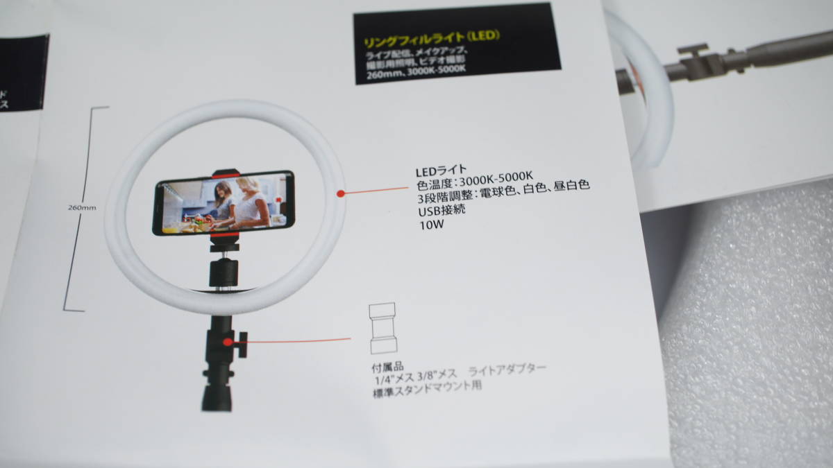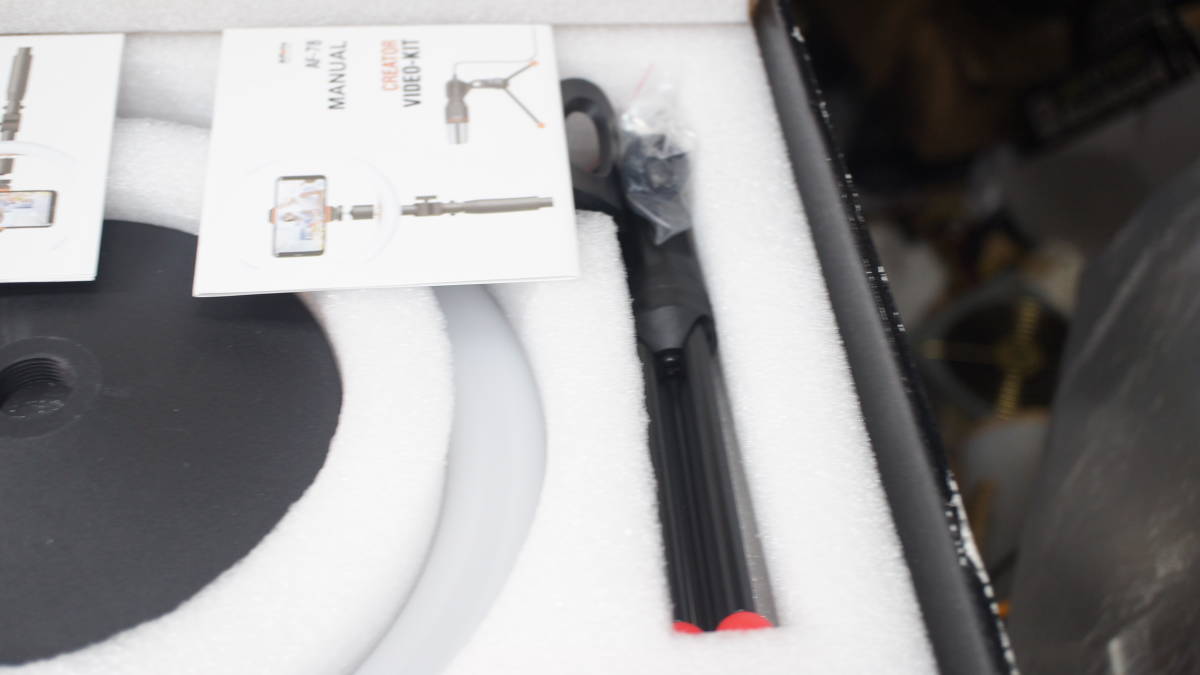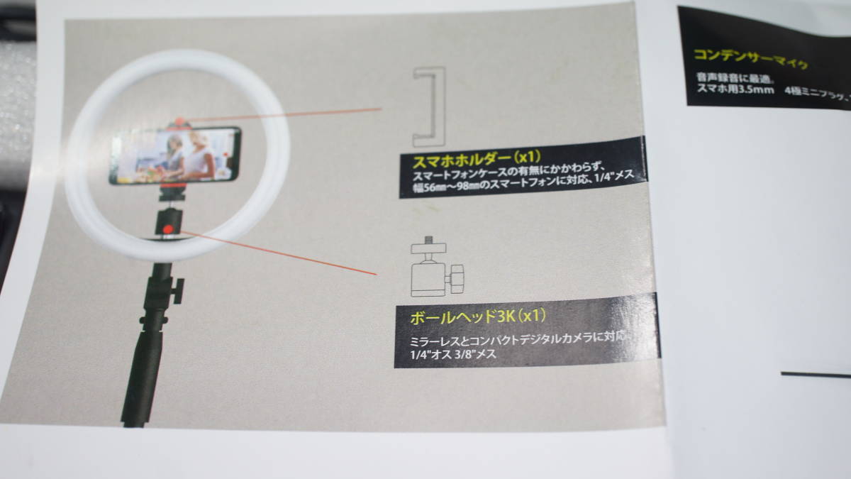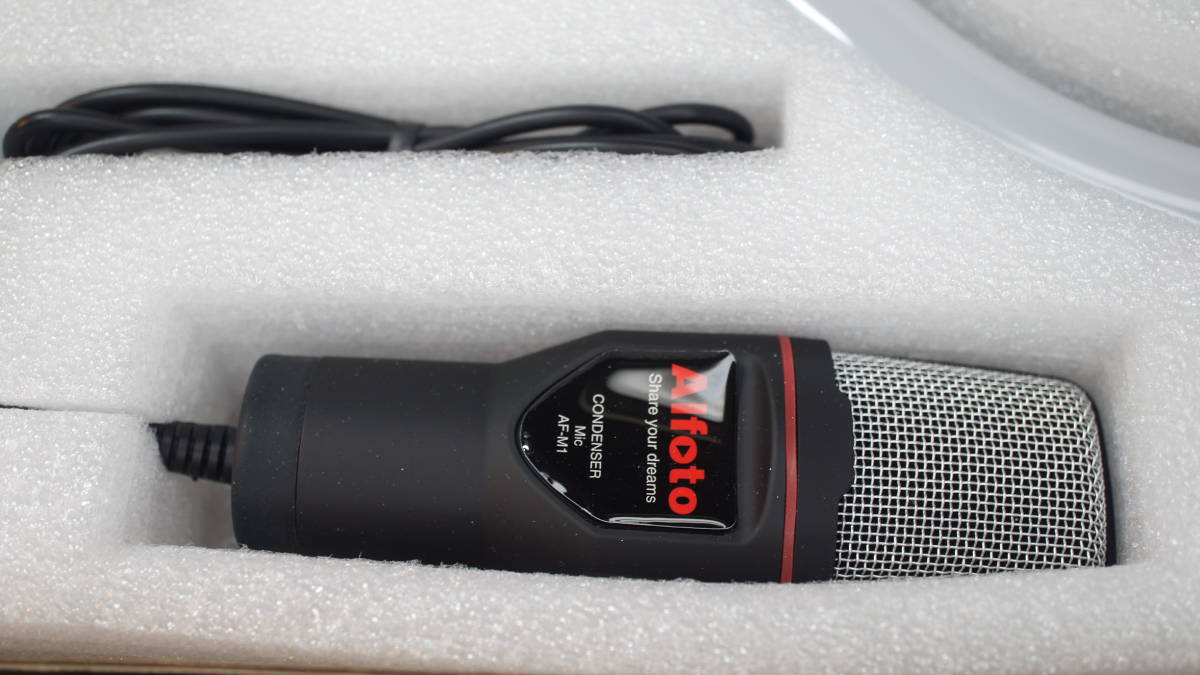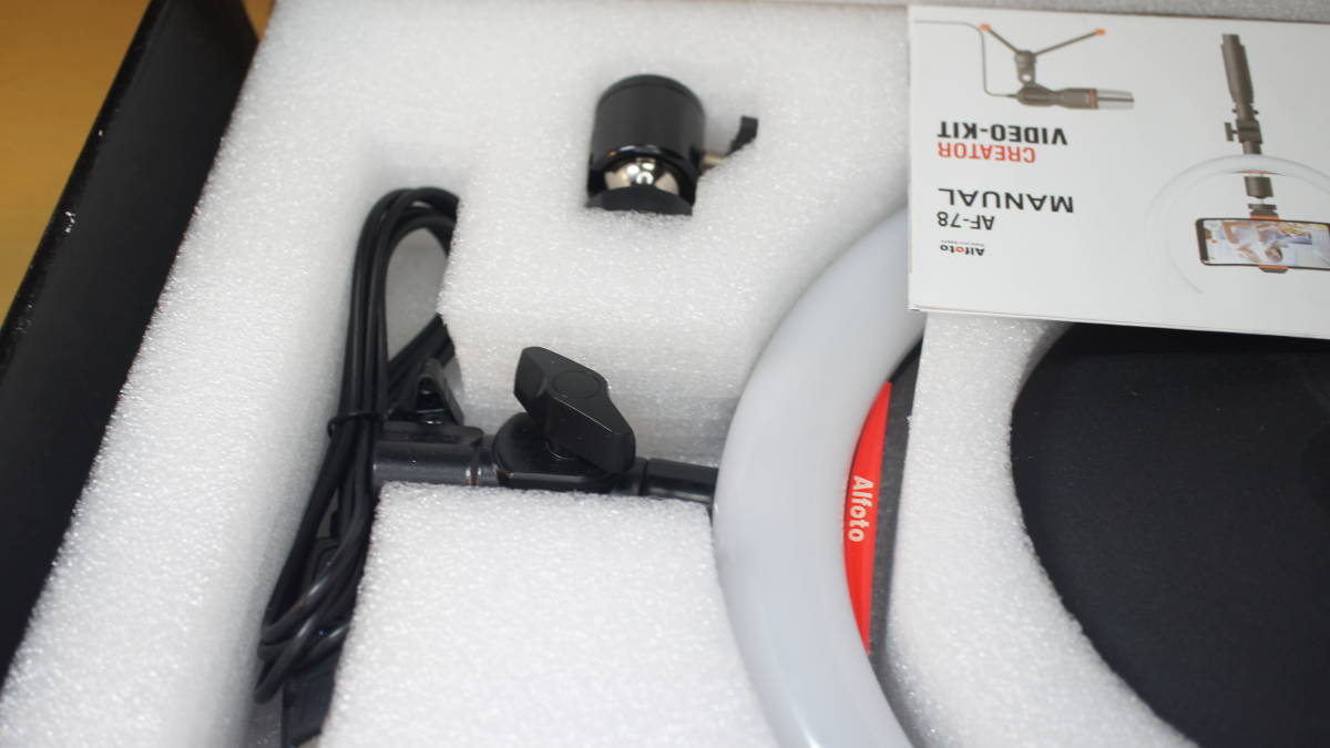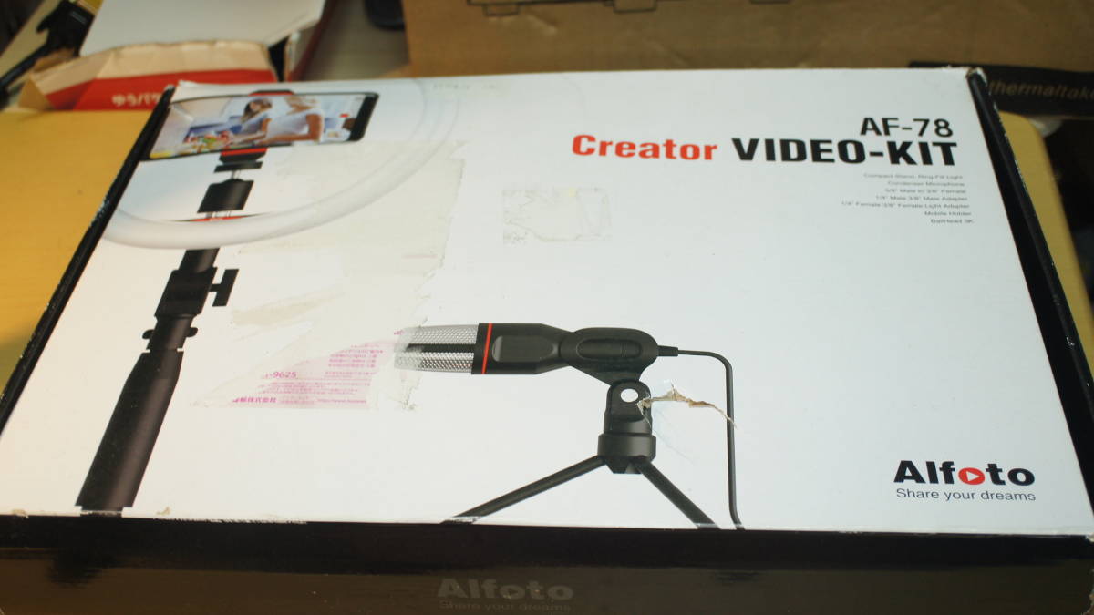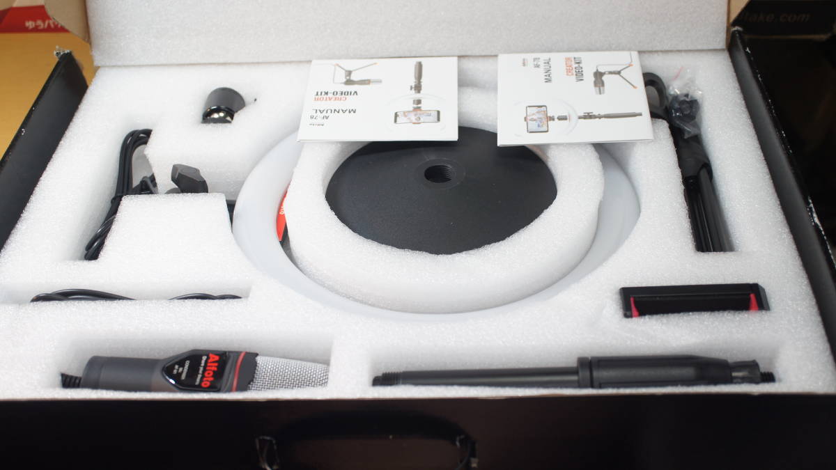 商品説明 | スマホ配信用キット、 スマホ/ライトスタンド+26cmリングフィルライト+コンデンサーマイク(スマホ用3.5mm4極ミニプラグ) がセットになった、 Alfoto AF-78 Creator VIDEO-KITです。