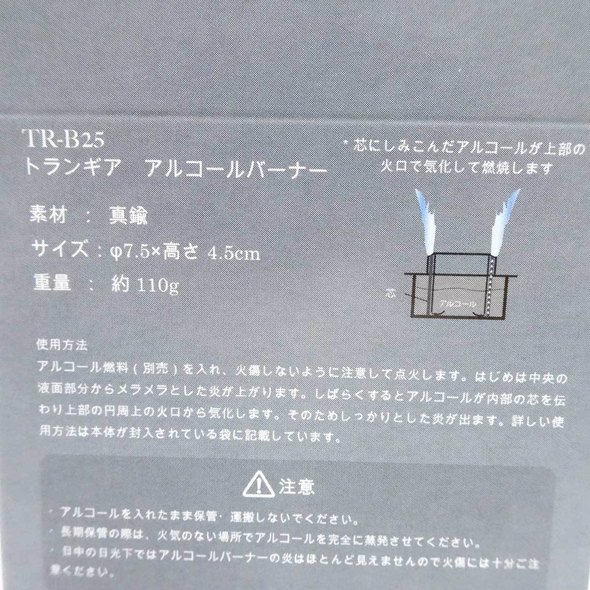 | ※商品は画像にあるものがすべてとなります。 【仕様】 ブランド:トランギア タイプ:アルコールバーナー スピリットバーナー [プリヒーター(TR-FV21)付] 型番:TR-B25 |