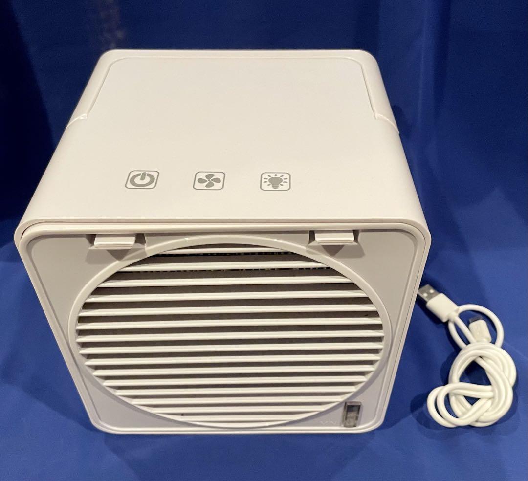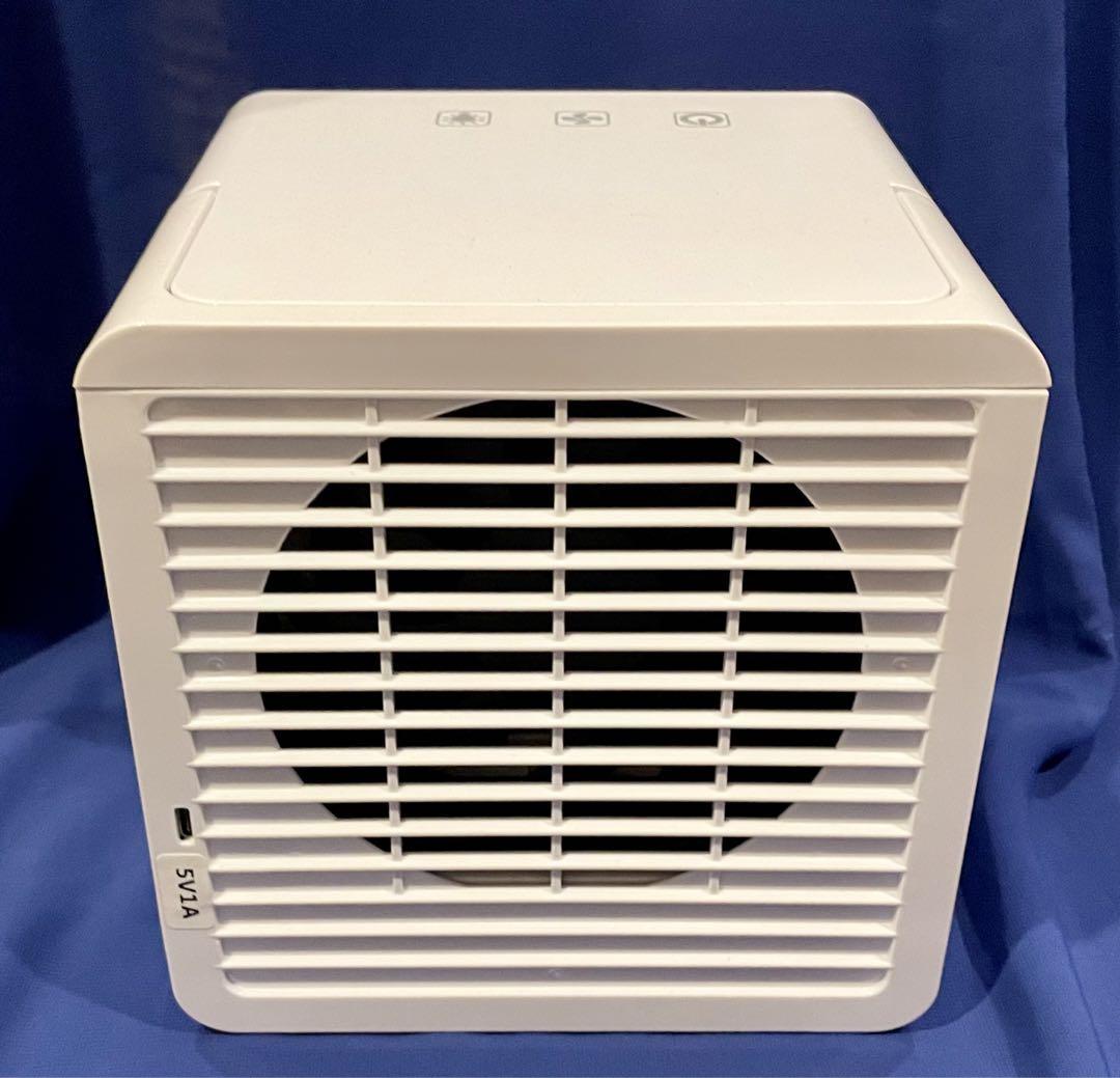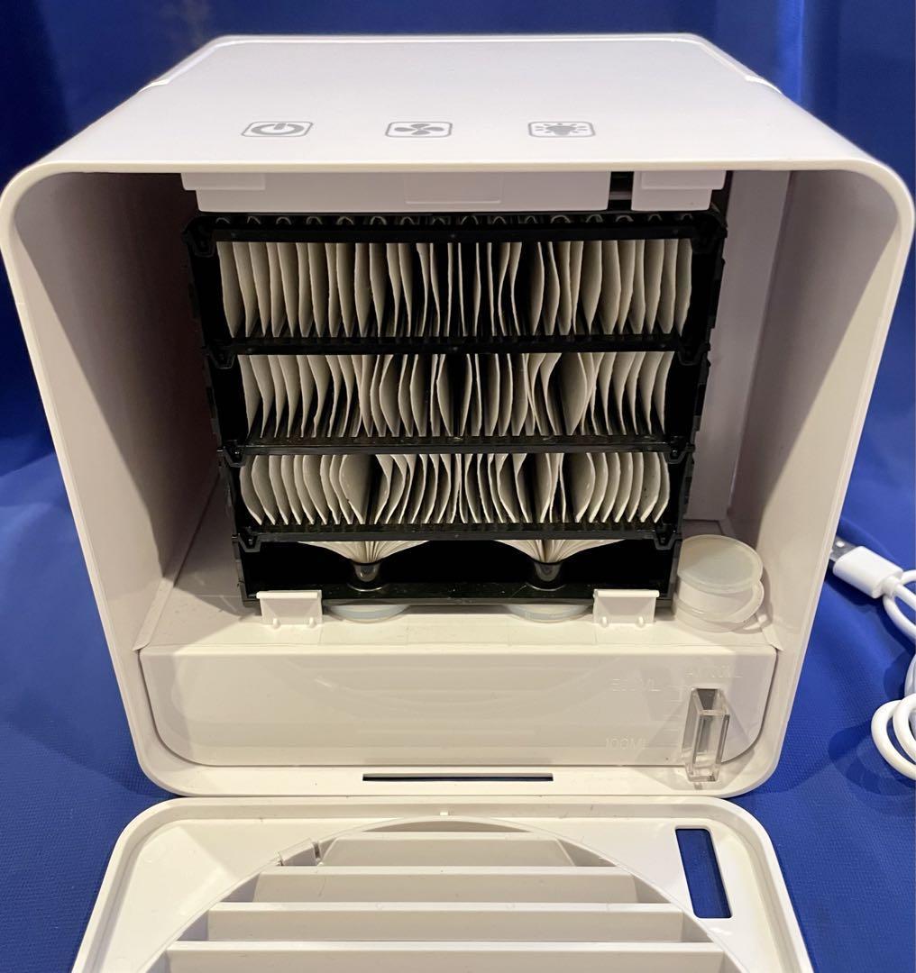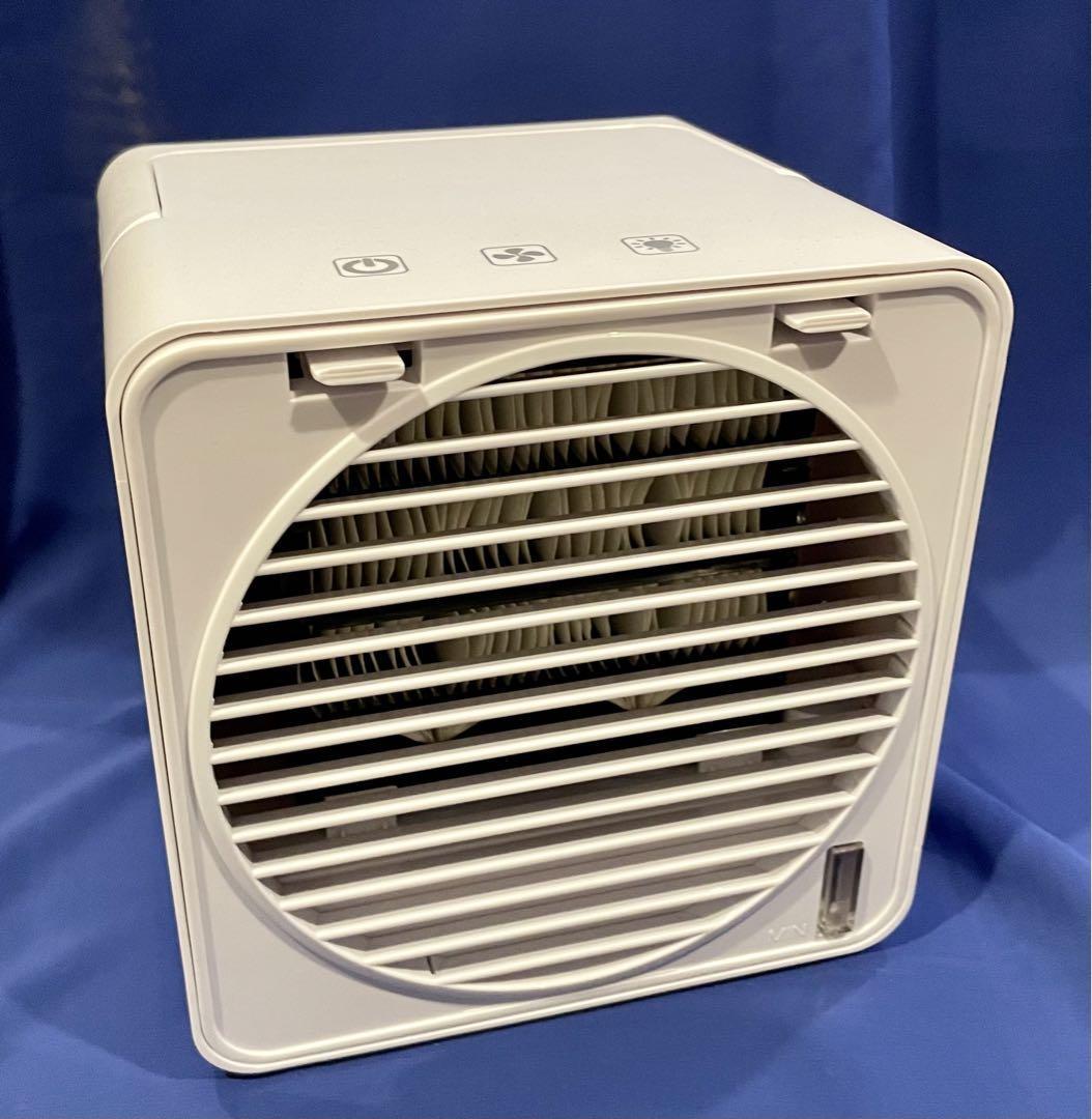 本体前面内部のキャップから水を入れて使用すると気加熱の原理を応用した涼しい風が吹き出すので、エアコンのように冷え過ぎることのない自然な涼しさを感じられます。