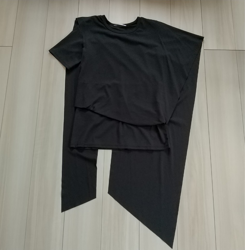 袖もアシンメトリー、前後もアシンメトリーの斬新なトップスです。