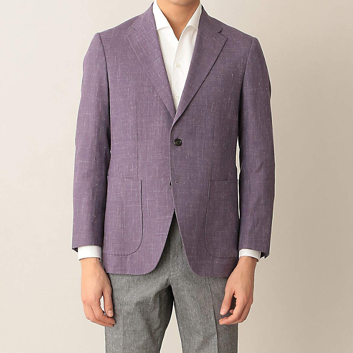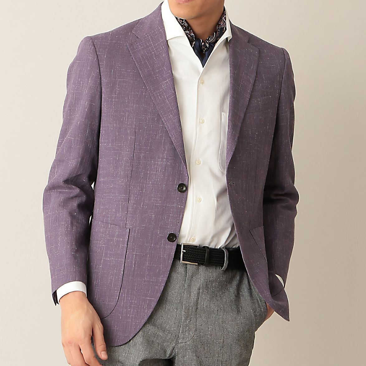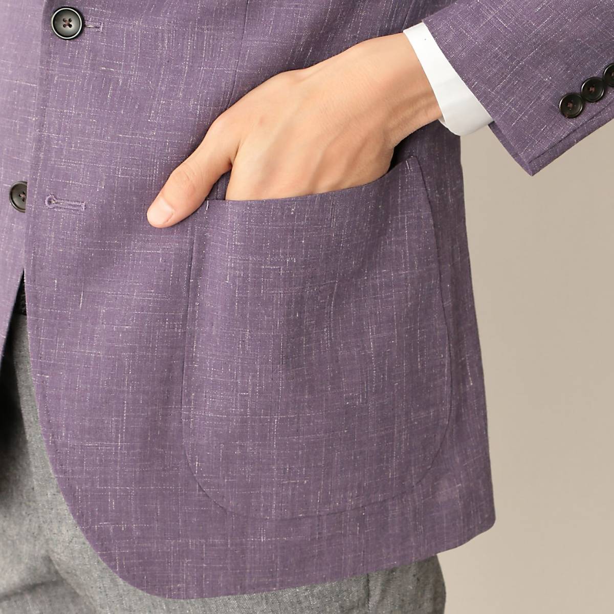 別注のウール・リネン・ポリエステル混紡糸とリネン100%糸を経・緯糸に交互配置して交織平織にして織り上げた素材。 混紡糸のリネンは作り出す、刷毛で掃いたようにかすれた線柄が浮く「刷毛目(はけめ)」調の表面感は見た目も涼やか。夏に適した軽めの素材です。綺麗な色目のカラージャケットとなっています。 麻の清涼感存分に発揮し夏までご着用いただけるよう、さらに一格ライトウェイトに仕上げたテーラードジャケットです。 ジャケットを保型する芯地を極力省いた構築的なアンコンジャケット。軽く快適な着心地を実現する次世代のジャケット。 シンプルでスタンダードなノッチドラペルに2ボタンのシングルテーラードジャケットを採用。 軽めの素材と美しい色合いのカラーで、着用感はもちろんカラーコーディネートにも夏に最適のジャケットです。 名称:リネンウールポリエステル交織/ハケメ調平織 三本の指に入る毛織物の一大産地、世界に誇る日本の尾州で織り上げたポリエステル混紡リネン生地。 生み出される生地たちの魅力も世界基準。生産量も国内の8割を占め、名実ともに日本で最大、世界基準の産地となっています。 リネンの清涼感を生かしつつも、エアータンブラー加工でリネン特有の素朴さは抑えた風合いに仕上げています。 ポリエステルを少量混紡することでデイリーのケアや耐久性への考慮も加えました。(目付:約240g/m2) |