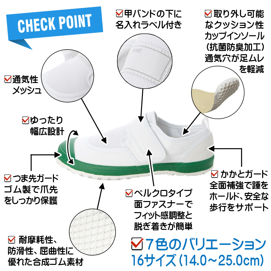 子供用の全サイズ14.0cm~25.0cmと豊富なサイズをご用意しており、通園・通学など、幅広い場面で活躍してくれる一足です。