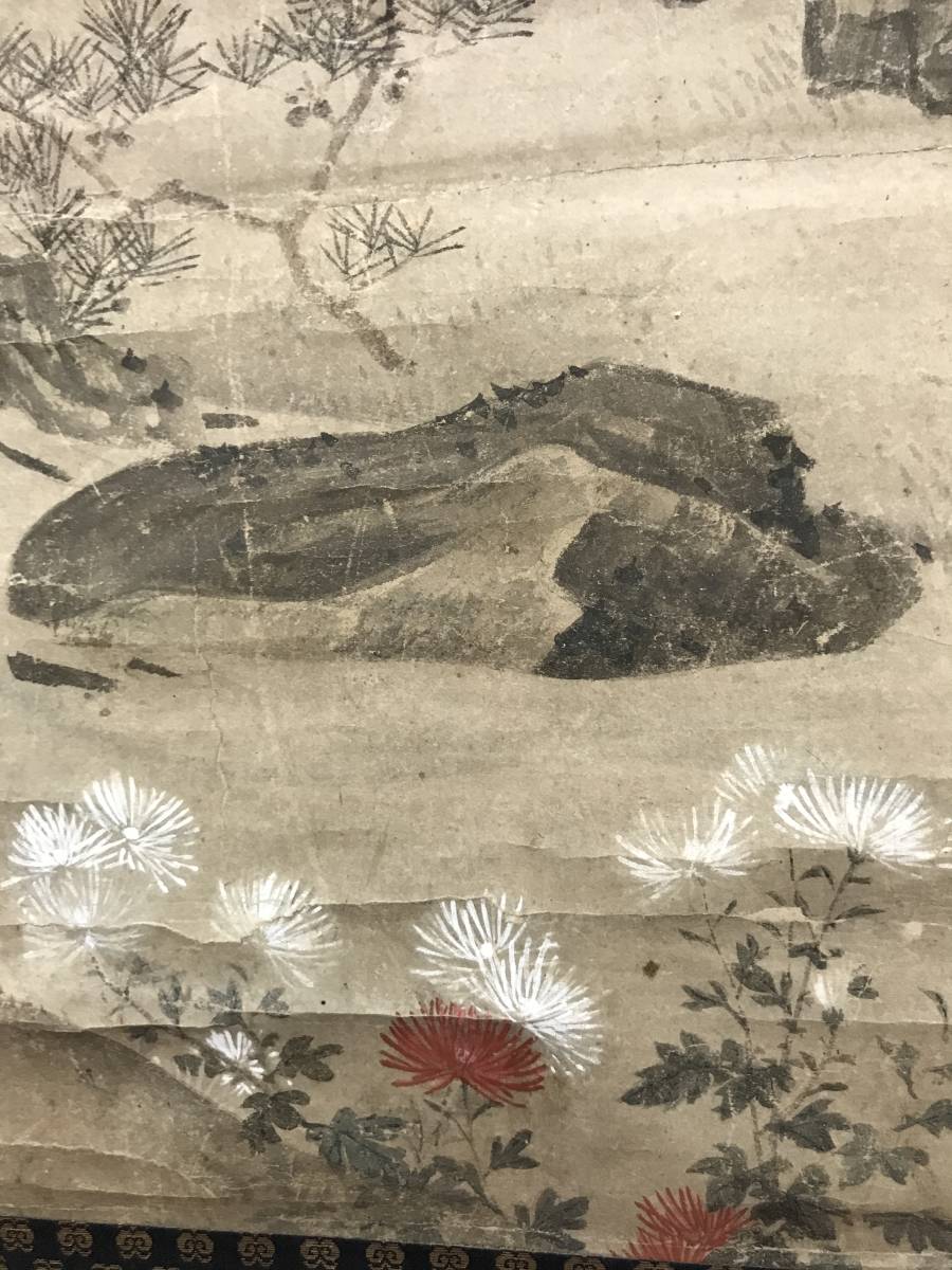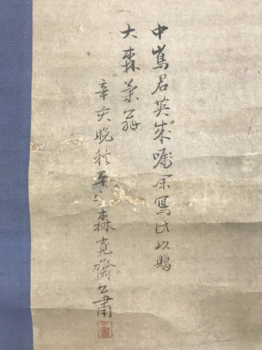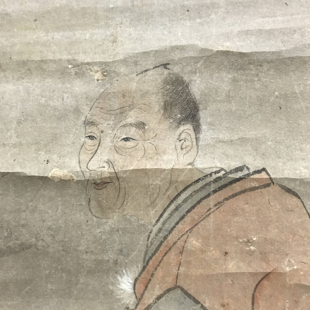 【作品状態】 本紙は紙本肉筆です。  本紙は時代感あり、全体に汚れシミ、多数の折れと巻シワ、多数の虫穴補修痕為書などあります。表装は全体に巻シワあります。