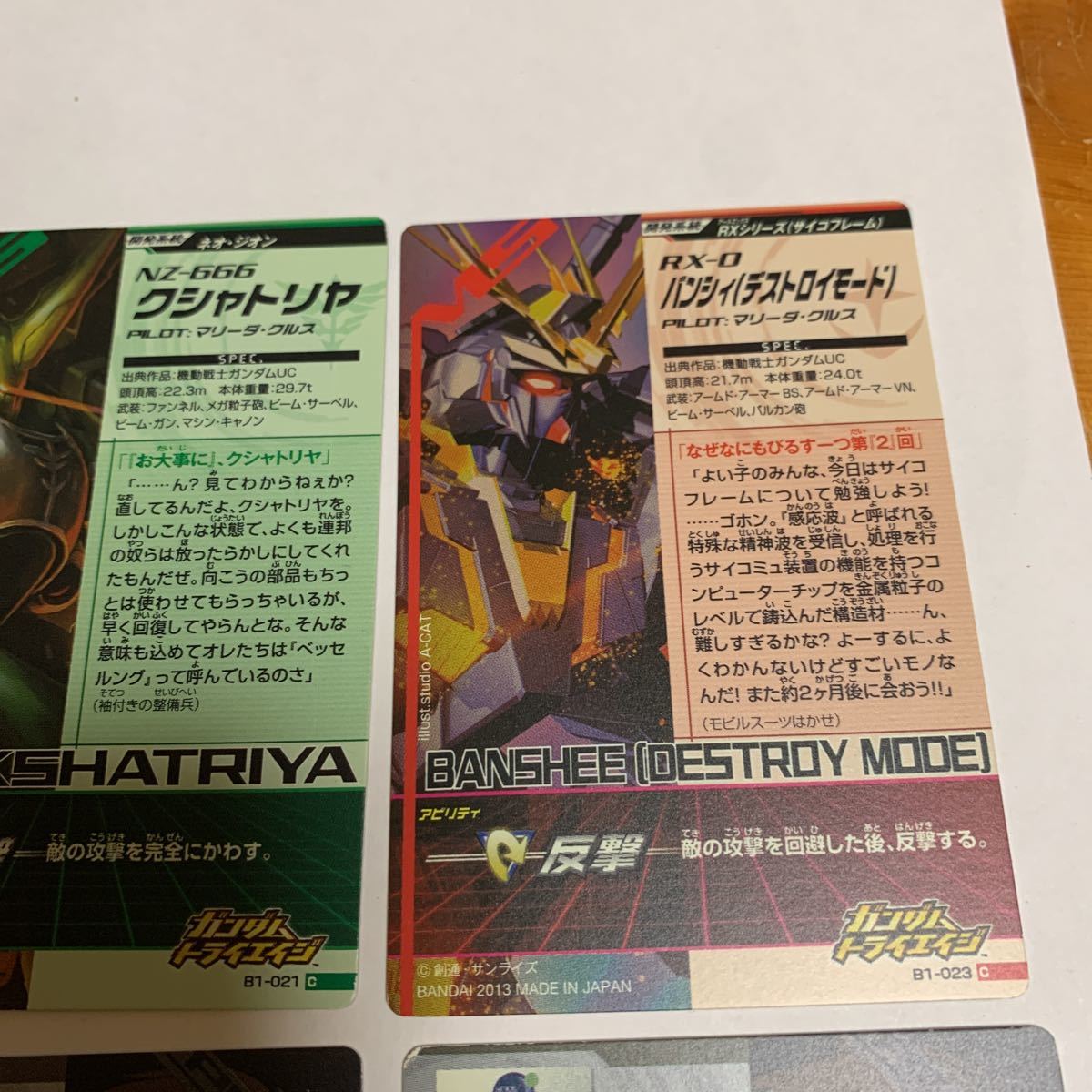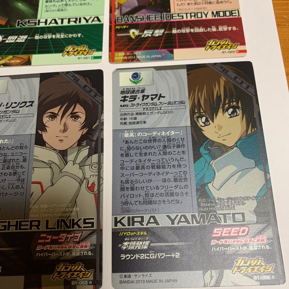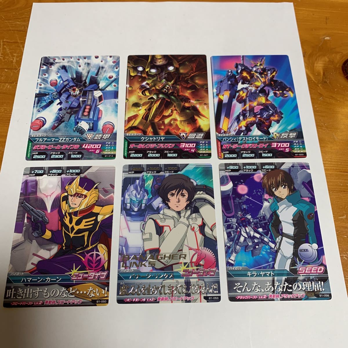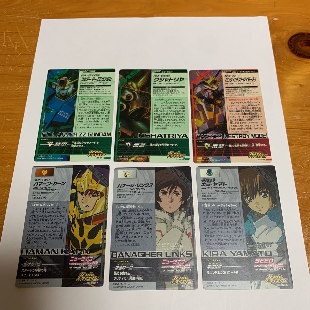ガンダムトライエイジ B1-058キラ・ヤマト B1-023 バンシィ(デストロイモード)等 6枚セット 2013 未使用 送料無料の出品です。 (自己紹介一読し落札願います。) B1-014 フルアーマーZ Zガンダム B1-021 クシャトリヤ B1-023 バンシィ(デストロイモード) B1-050 ハマーン・カーン B1-053 バナージ・リンクス B1-058キラ・ヤマト 納戸の整理(断捨離)で今後使用予定が ない為出品しました。 衣装ケースに入れて保管してました。