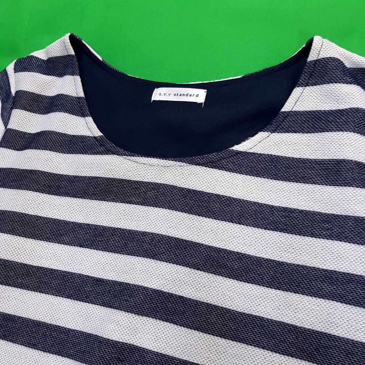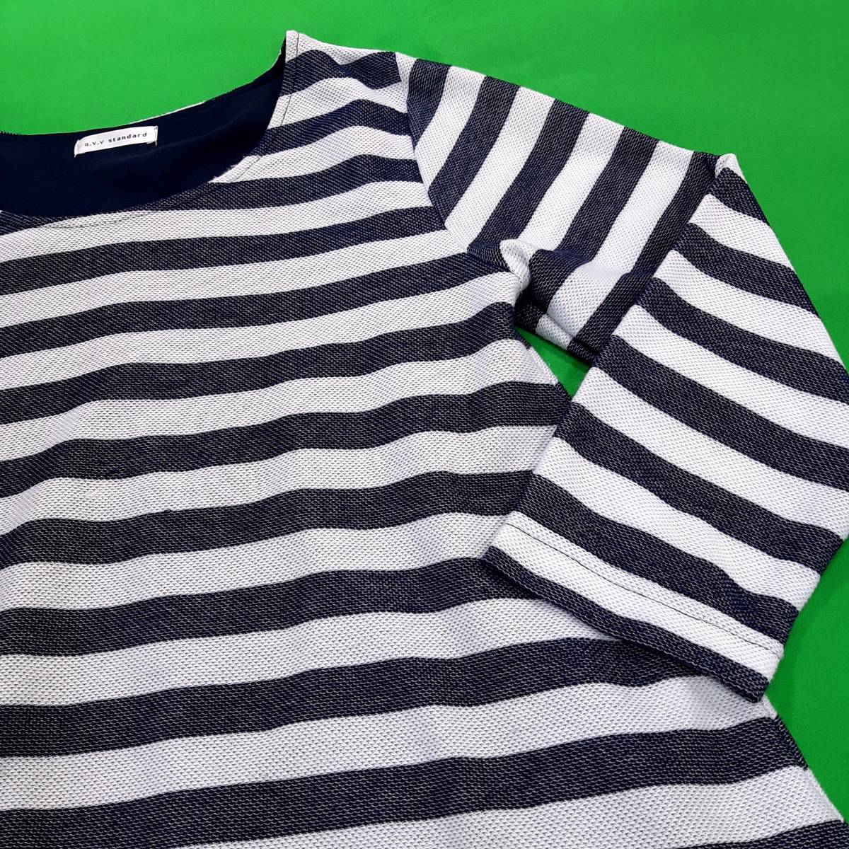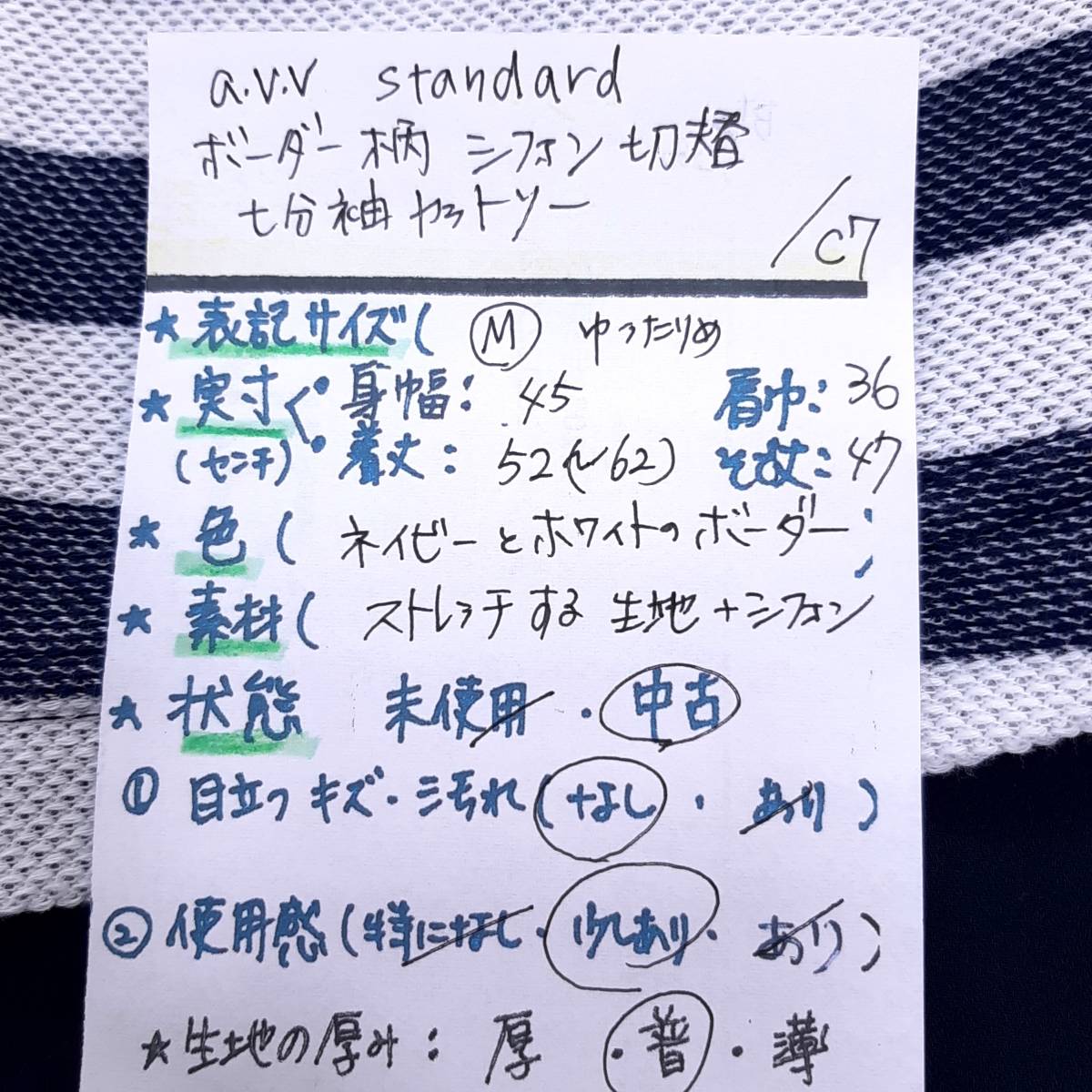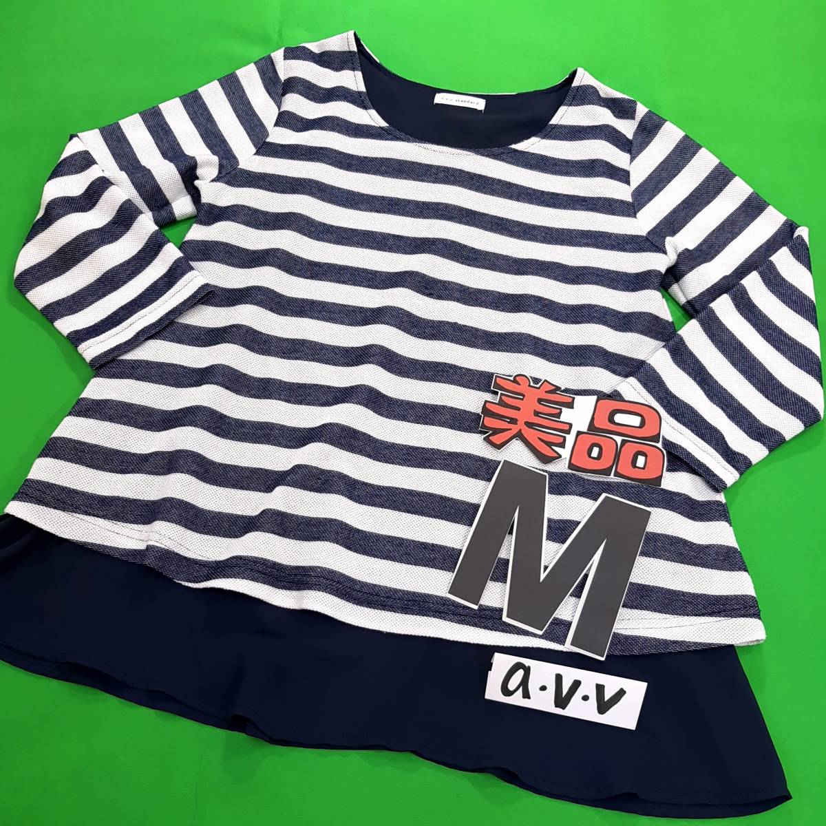 c7★美品 a.v.v standard★送料無料★ボーダー柄 シフォン切替ドッキングデザイン 7分袖カットソー★レディース Mサイズ ネイビー紺色