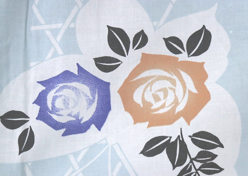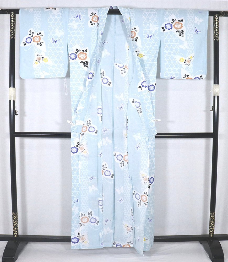 | 色・柄 | 女性用 浴衣 レトロ調 水色地 薔薇・アゲハ蝶 上品な浴衣です。 ※お使いのディスプレイの種類や設定の差により 実物の色と画像の色が少々異なることもございます。 |