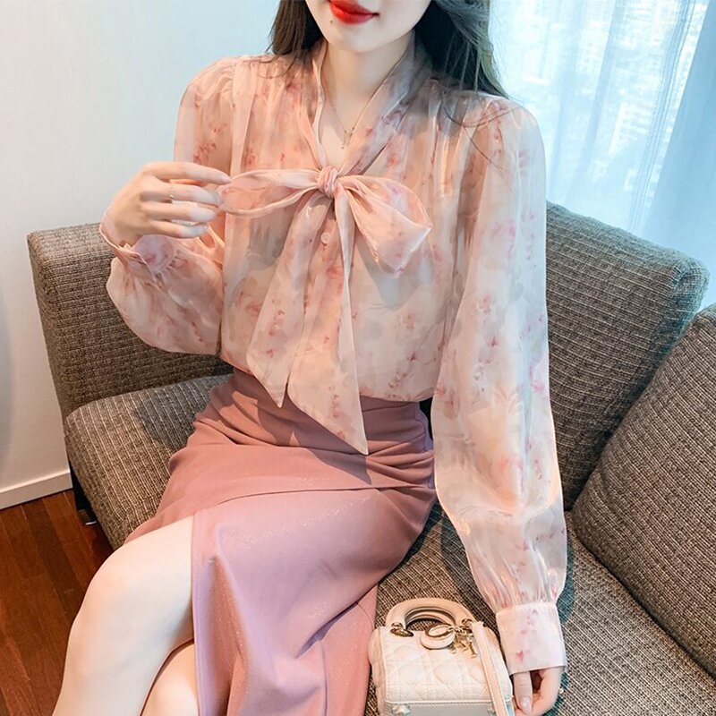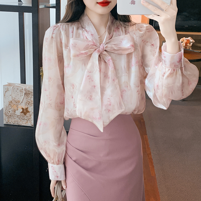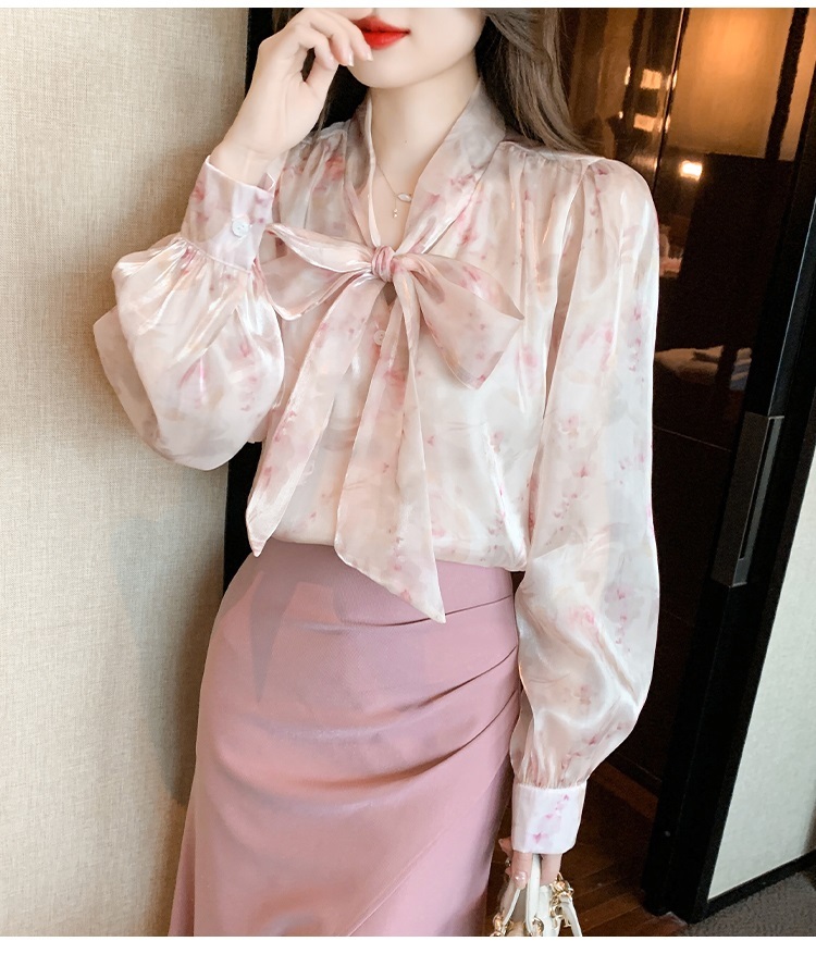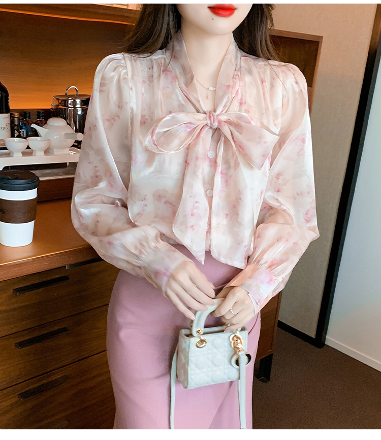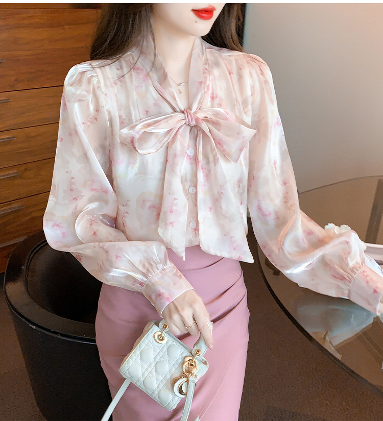 「同梱1万円送料無料」S~XLサイズ秋新品* レディースきれいめ*可愛い*花柄*総柄*リボン*ボウタイ*長袖ブラウスシャツ*ピンク