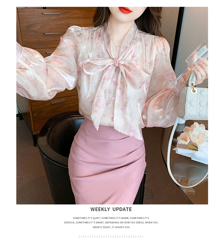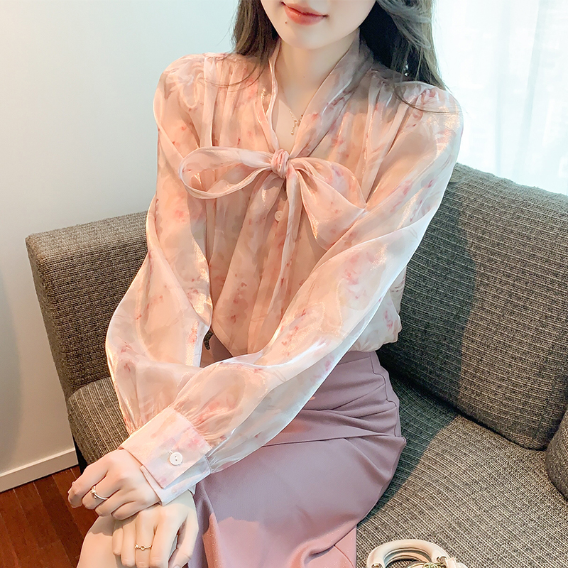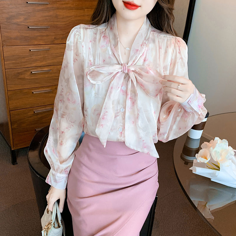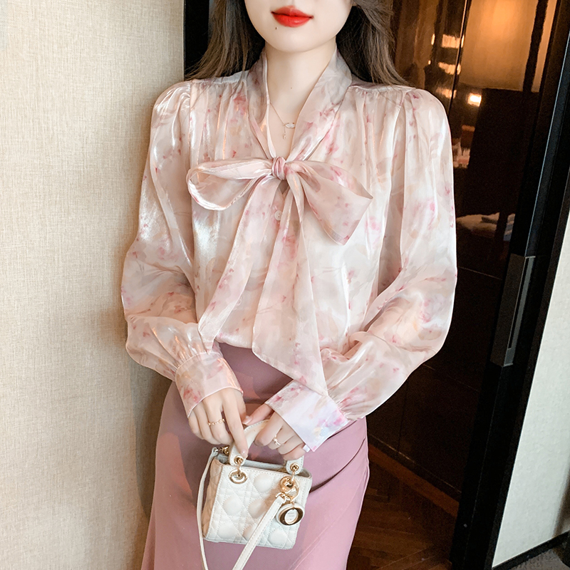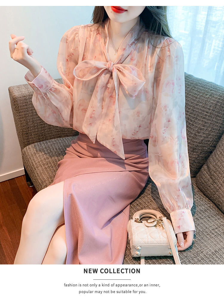 「同梱1万円送料無料」S~XLサイズ秋新品* レディースきれいめ*可愛い*花柄*総柄*リボン*ボウタイ*長袖ブラウスシャツ*ピンク