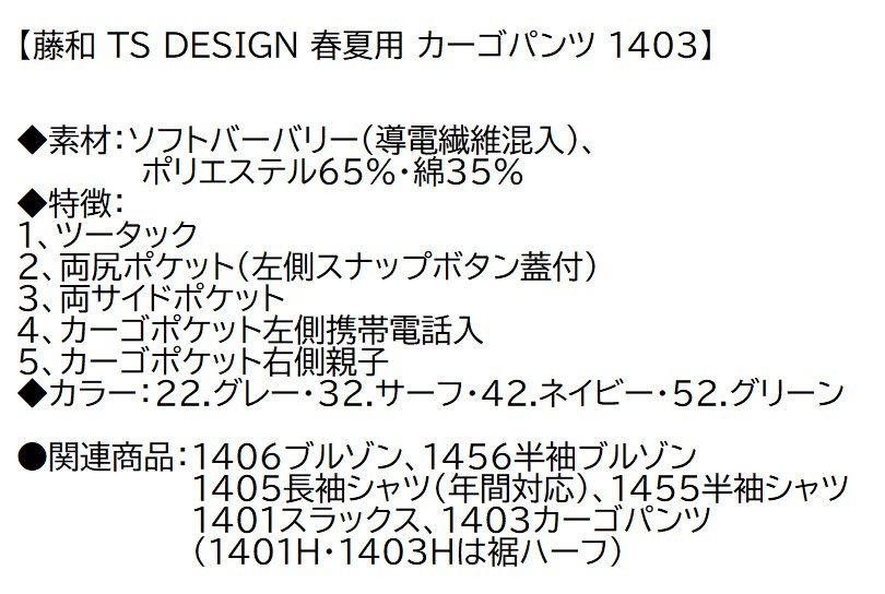 ビックイナバ特価◇TSDESIGN 1403[春夏]カーゴパンツ【32サーフ・W79cm】ソフトバーバリー生地・定価1枚7480円の品、2枚即決2980円