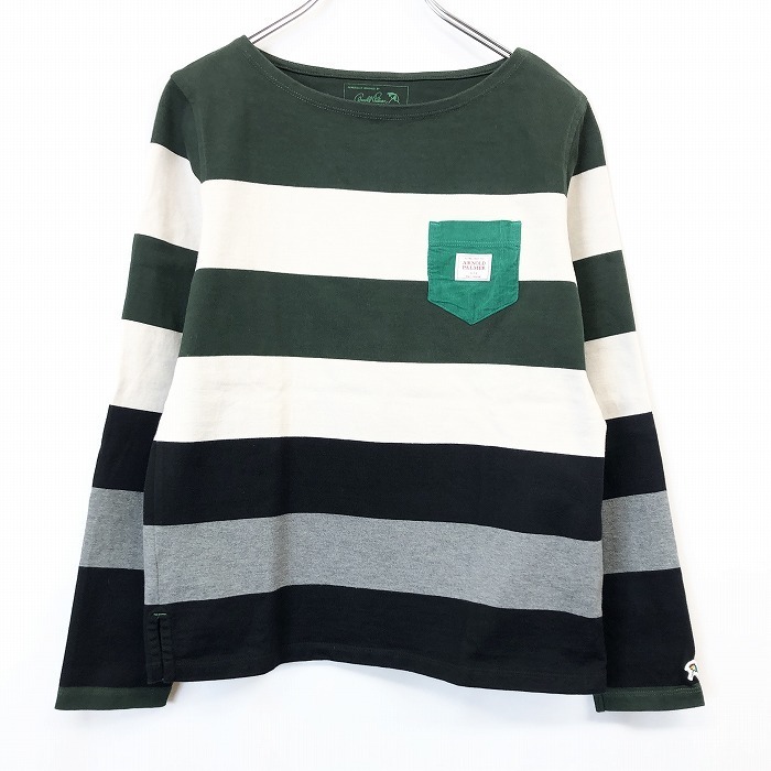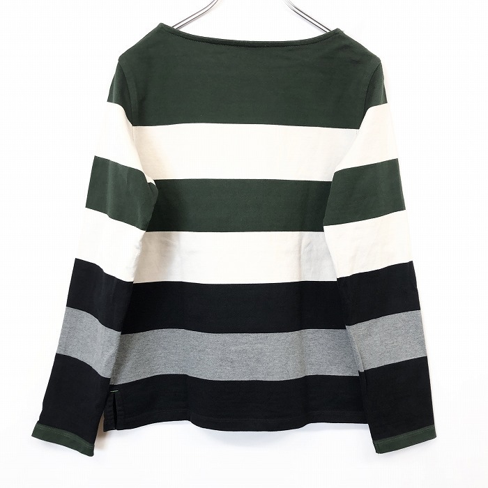 商品タイトル | Arnold Palmer - 3 レディース バスクシャツ カットソー Tシャツ 太めボーダー ボートネック 長袖 綿100% 緑×オフホワイト×黒×杢グレー |