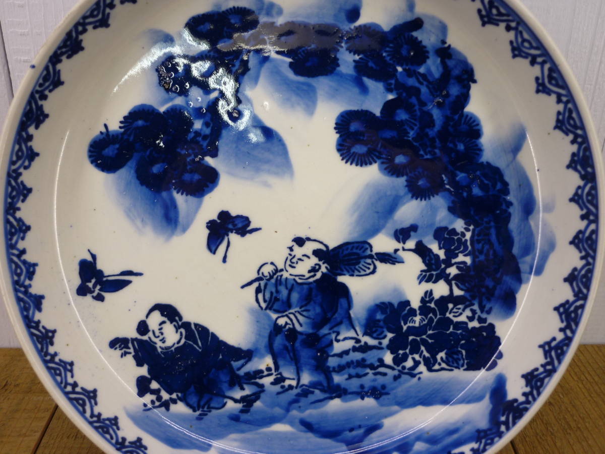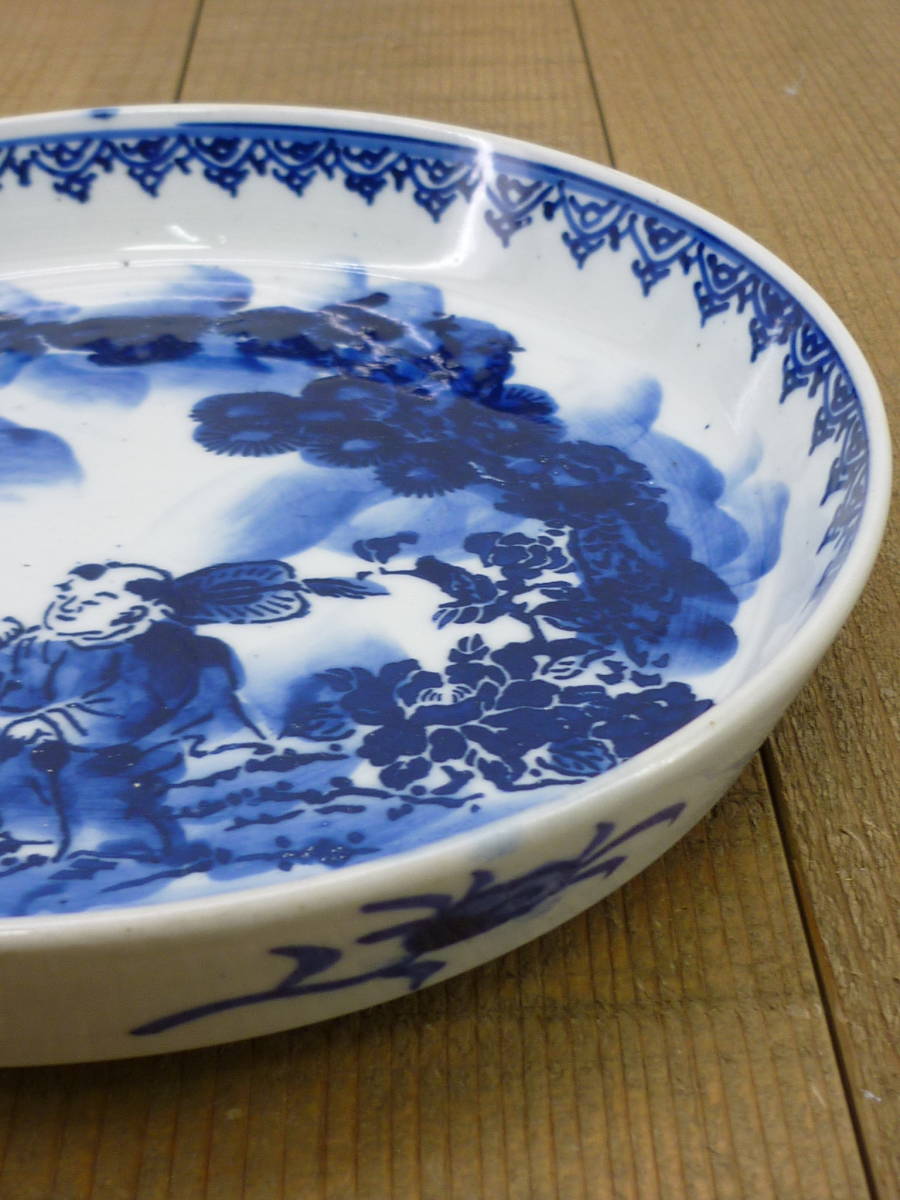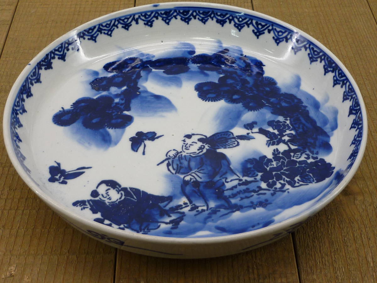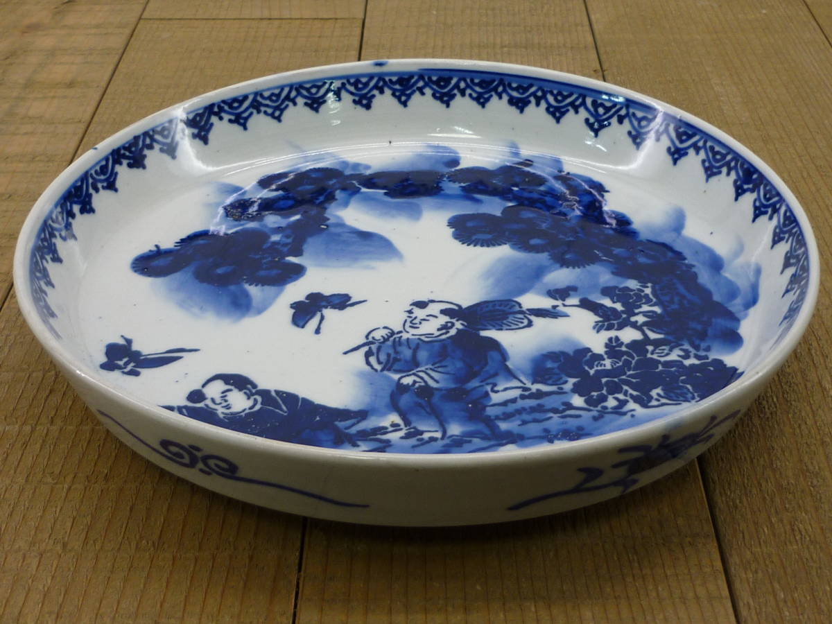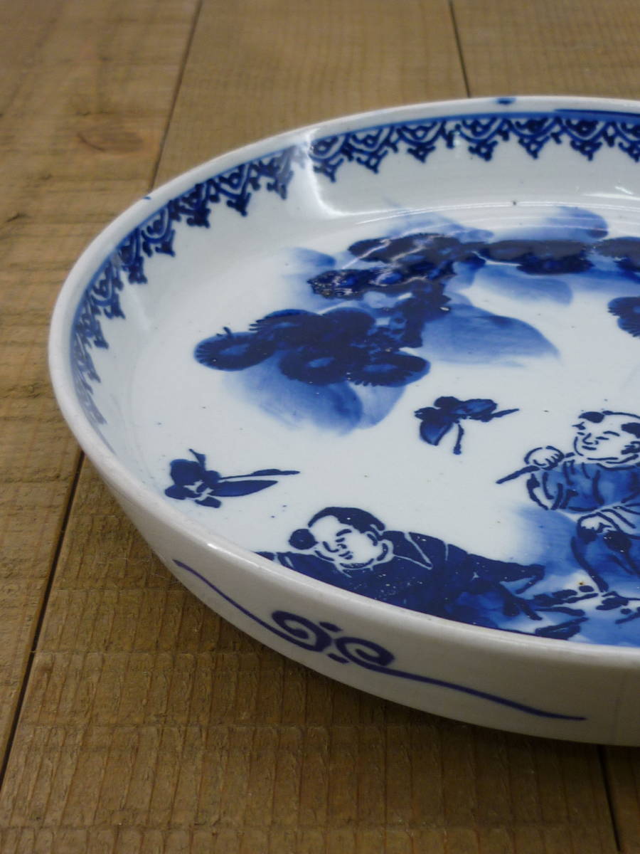 骨董 古伊万里 江戸幕末~明治初期 染付七寸大皿 松唐子蝶文輪宝縁 コバルト