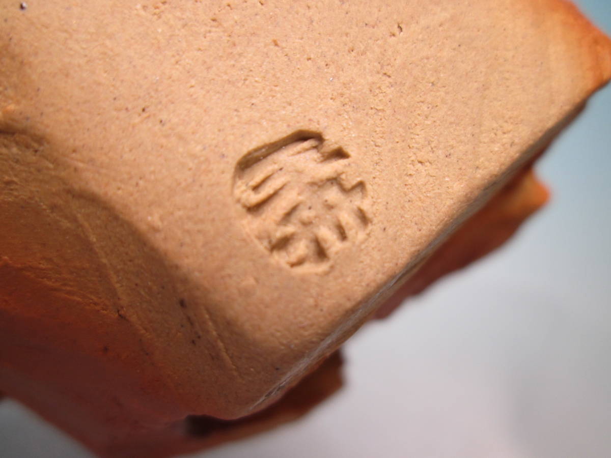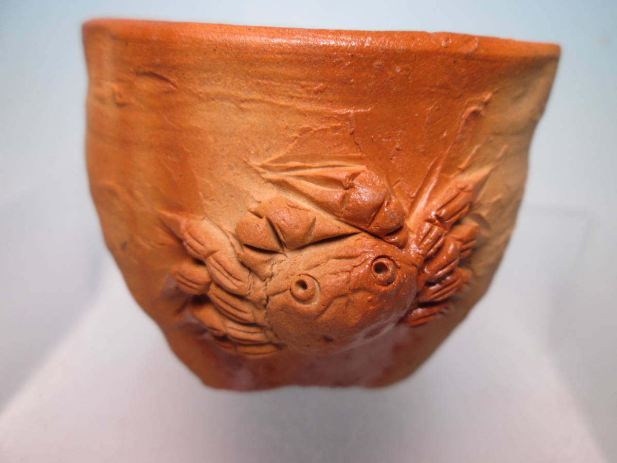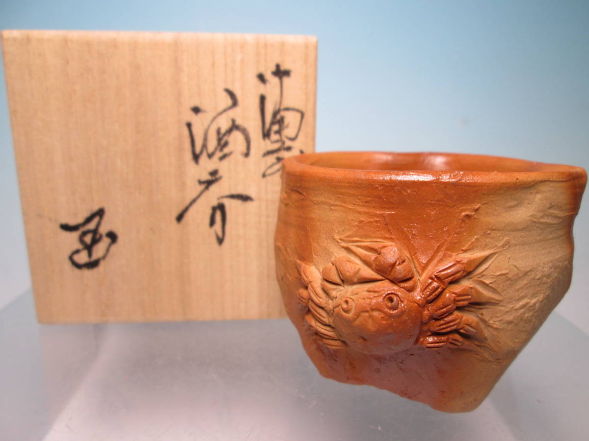 ☆備前焼 作者不詳 三舟? 備前 緋襷蟹彫刻酒呑(箱付)酒器 ぐい呑