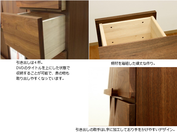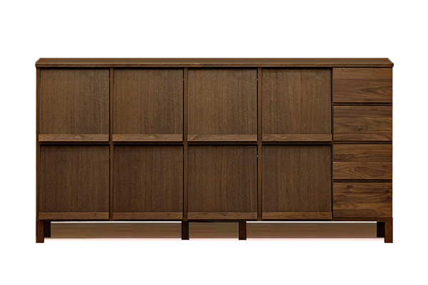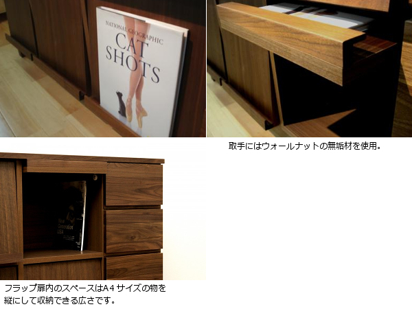 天然木ウォールナット材のナチュラルな素材感に包まれたマガジンラック。本体、塗料を含めてホルムアルデヒドの発生を極力抑えたF☆☆☆☆仕様、人体や環境に優しい安心の日本製品です。雑誌等を飾った間ままスムーズに開閉するフラップ扉、丈夫な箱組み引き出し等、実用的かつシンプルで飽きのこないデザインです。