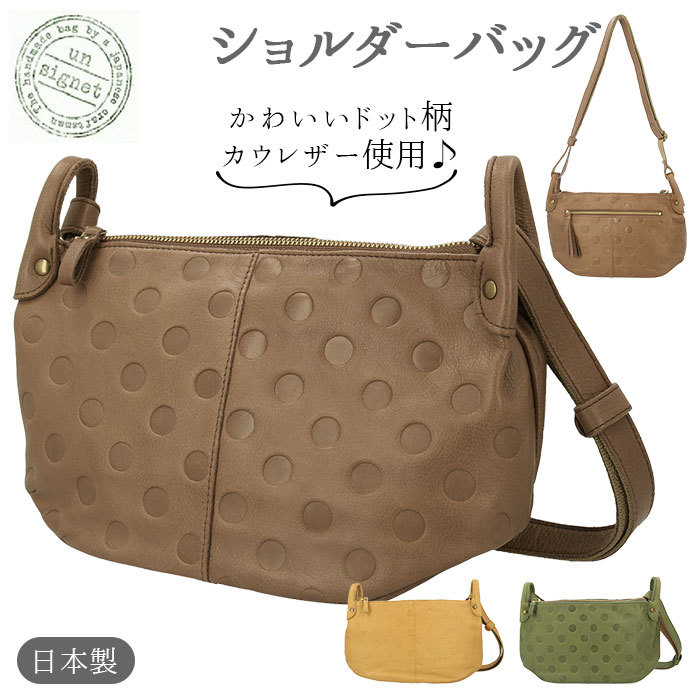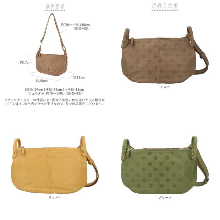 商品説明 | ・ふんわりと柔らかな手触りの日本製のカウレザーにドット柄を施した、女性らしい優しいデザインのシリーズ。 ・人気の【Klara】シリーズの使い勝手の良いドット柄ショルダーバッグ。 ・小ぶりなサイズ感なのでちょっとしたお出掛けにも使いやすく、革がソフトで軽いので持ち運びがしやすいデザイン。 ・内側部分にはファスナーポケットが1つ、オープンポケットが2つ、背面にはファスナーポケットが1つあり、小分けなどもしやすい仕様。 ・ショルダーベルトも長さ調整が出来るので、肩掛け~ななめ掛けが可能。 ・表情豊かな本革ならではの経年変化を、日々育てながらお楽しみください。 |