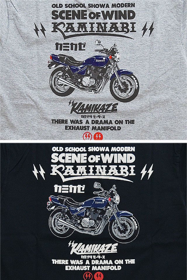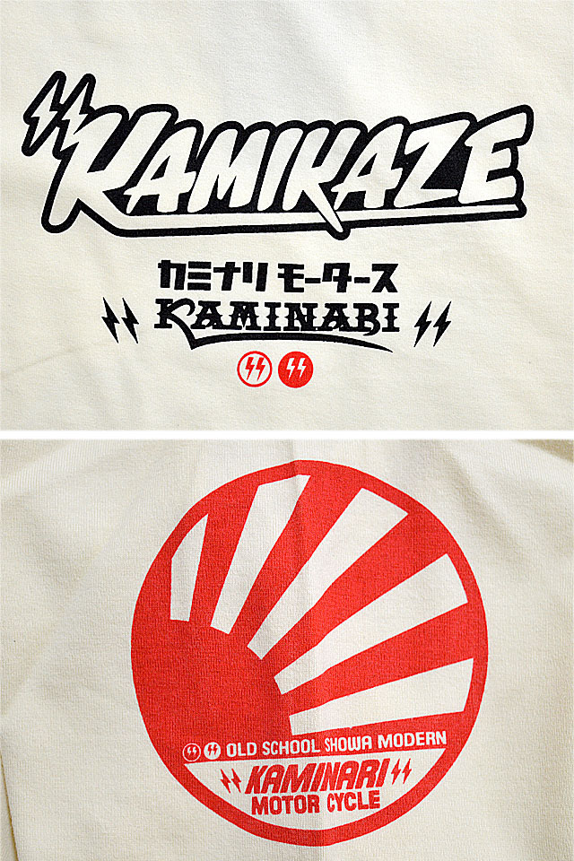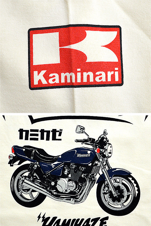 「JAPANESE BAD BOY」をコンセプトに掲げ、昭和の由緒正しき不良文化にロックなスパイスを注入したブランド「カミナリ」より「カミカゼロングTシャツ(KMLT-221)」が入荷してまいりました。 ネイキッドバイク人気に火をつけた漢のバイクがモチーフです。 バックにしっかり柄を入れている分、フロントはシンプルにデザインし、メリハリを付けました。 生地には、カミナリお馴染のよれにくくタフなボディーを採用しています。 | |||||||||||||||||||||||||