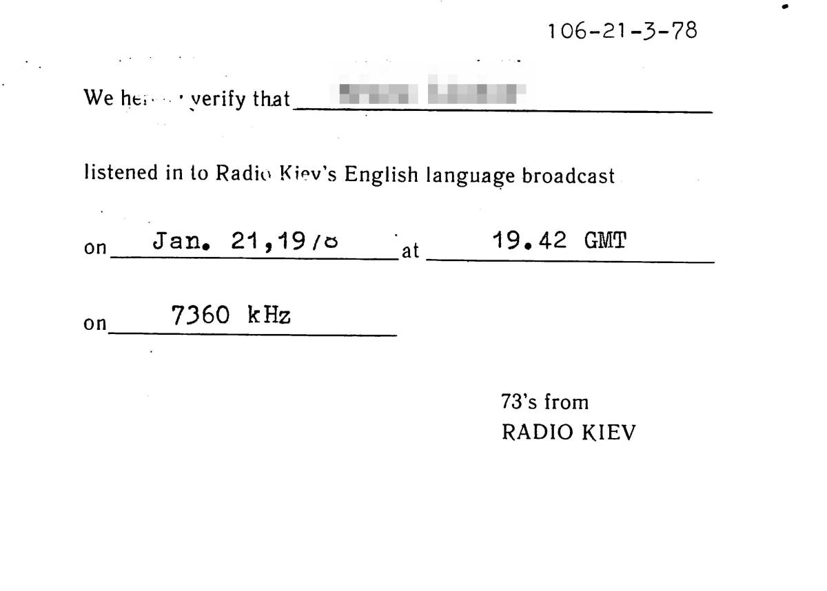 | 【商品名】・・・RADIO KIEV(★ラジオ・キエフ)のベリカード。 【コメント】・・・旧ソビエト連邦時代の大変、貴重なベリカードです! ■当方、1枚のみ所有していますので即決で落札者様のコレクションになります! 【国名・地名】・・・ウクライナ★首都 キーウ。 【受信データ】・・・1978年1月21日・SW7360KHZを受信。 【記載事項】・・・受信データ・受信者の氏名が記載。 【状態】・・・シワ、汚れ、シミ、焼け、ハガレ、色あせ等があります。 ■カードの状態は★画像を参考に判断して下さい。 ■この機会にぜひこのベリカードを貴方のBCLコレクションに加えて下さい! | |
