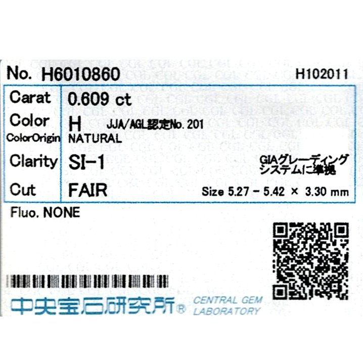 | 天然ダイヤモンドルース 0.609ct H/SI-1/FAIR ラウンドブリリアントカット 中央宝石研究所 ソーティング付き | ||||