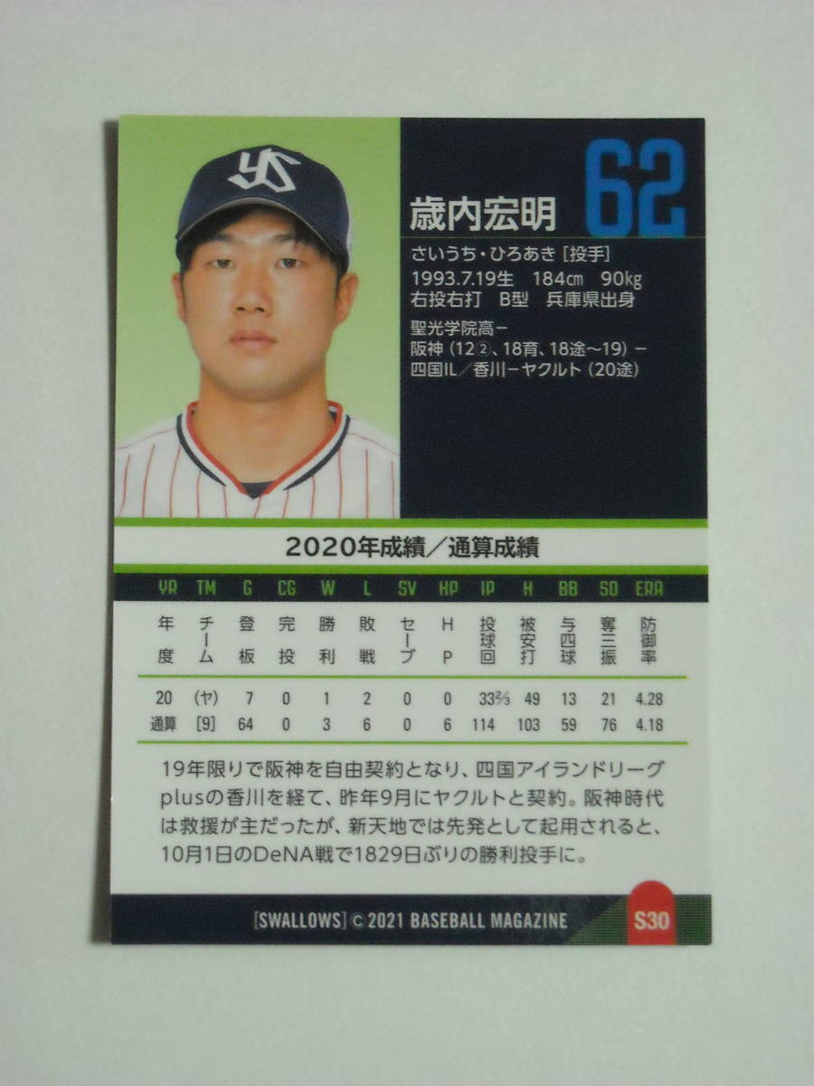歳内宏明 #30 2021 BBM 東京ヤクルトスワローズ 兵庫県尼崎市 福島:聖光学院高等学校卒 NPB通算防御率4.18