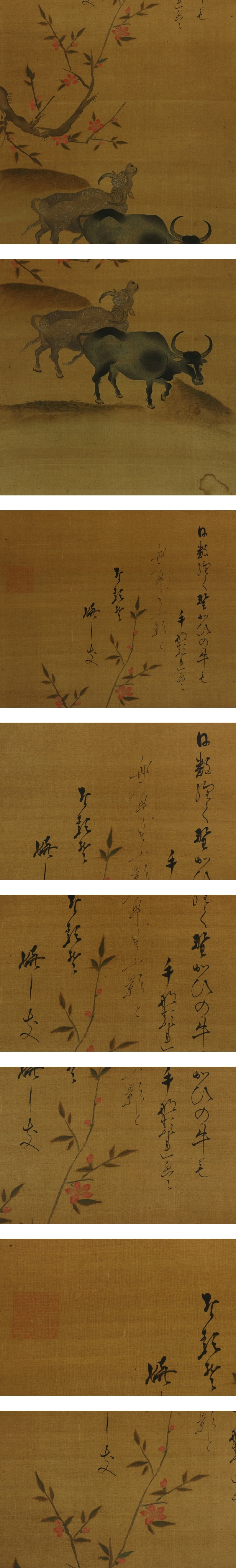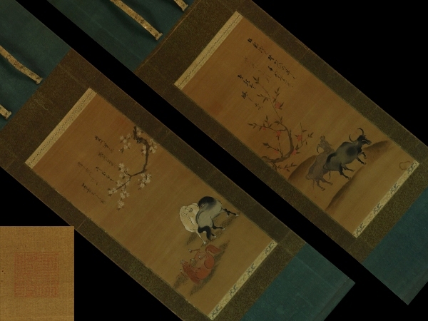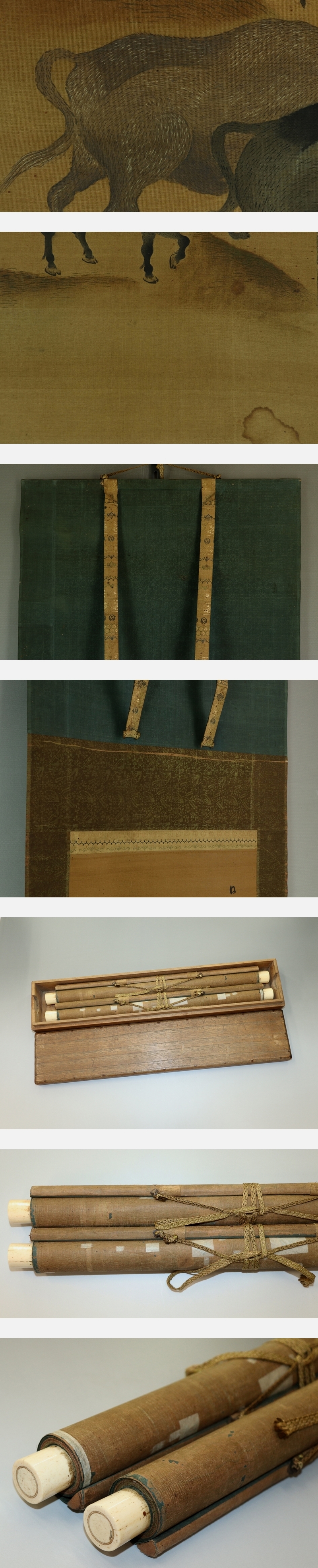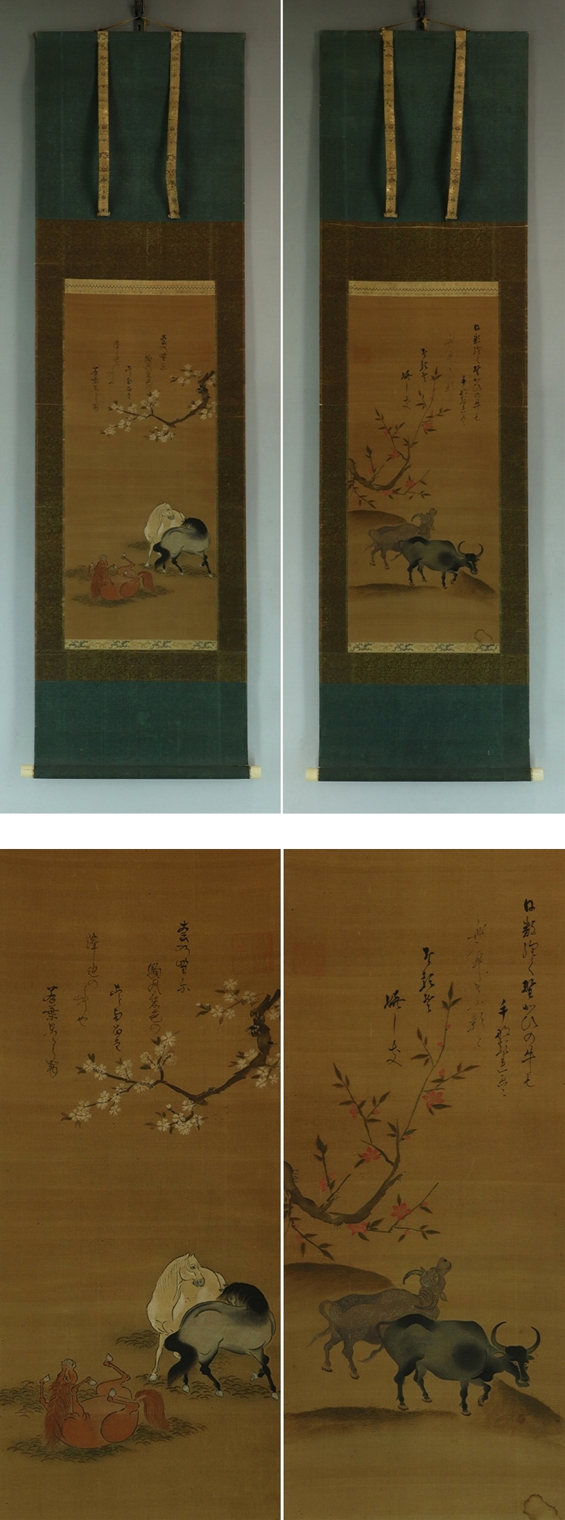 | №2109176 希少【真作】上杉勝周【双幅・牛馬図】◆絹本◆合箱◆掛軸 | |