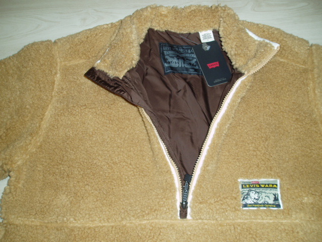 リーバイスLAKESIDE ボアフリースジャケット 新品です。税込定価:22,000円 アメリカのサイズのMサイズです。日本サイズのL相当 175-185cm 実寸:身幅61・そで丈63・肩幅52・着丈71 (単位はcmです。誤差はご容赦ください) 暖かいシェルパを使用したモックネックジャケット。 1枚で着ても、ジャケットの下に重ね着してもOK。襟元から入り込む冷気をモックネックが防ぎます。 ブラウン調のボディにアクセントのホワイトカラーのパイピングを施したデザインです。 トラッカージャケット、薄手のフーディー等のアウターとして、またアウターのインナージャケットとしても着ることが出来、防寒としてだけでなく、スタイリングの幅を広げてくれる一着です。 | |||