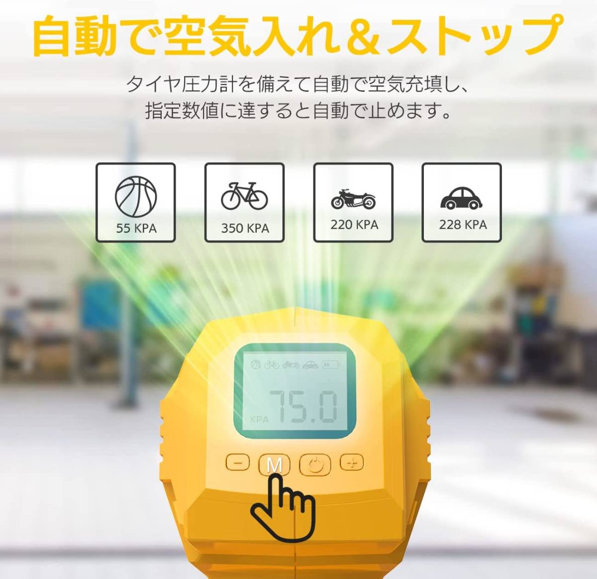 ・145PSIの圧力と55L/Min(2 CFM)までの空気を供給することができ、60秒以内にタイヤに空気を充填することができます。また、設定した空気圧数値まで達すると自動で停止します。