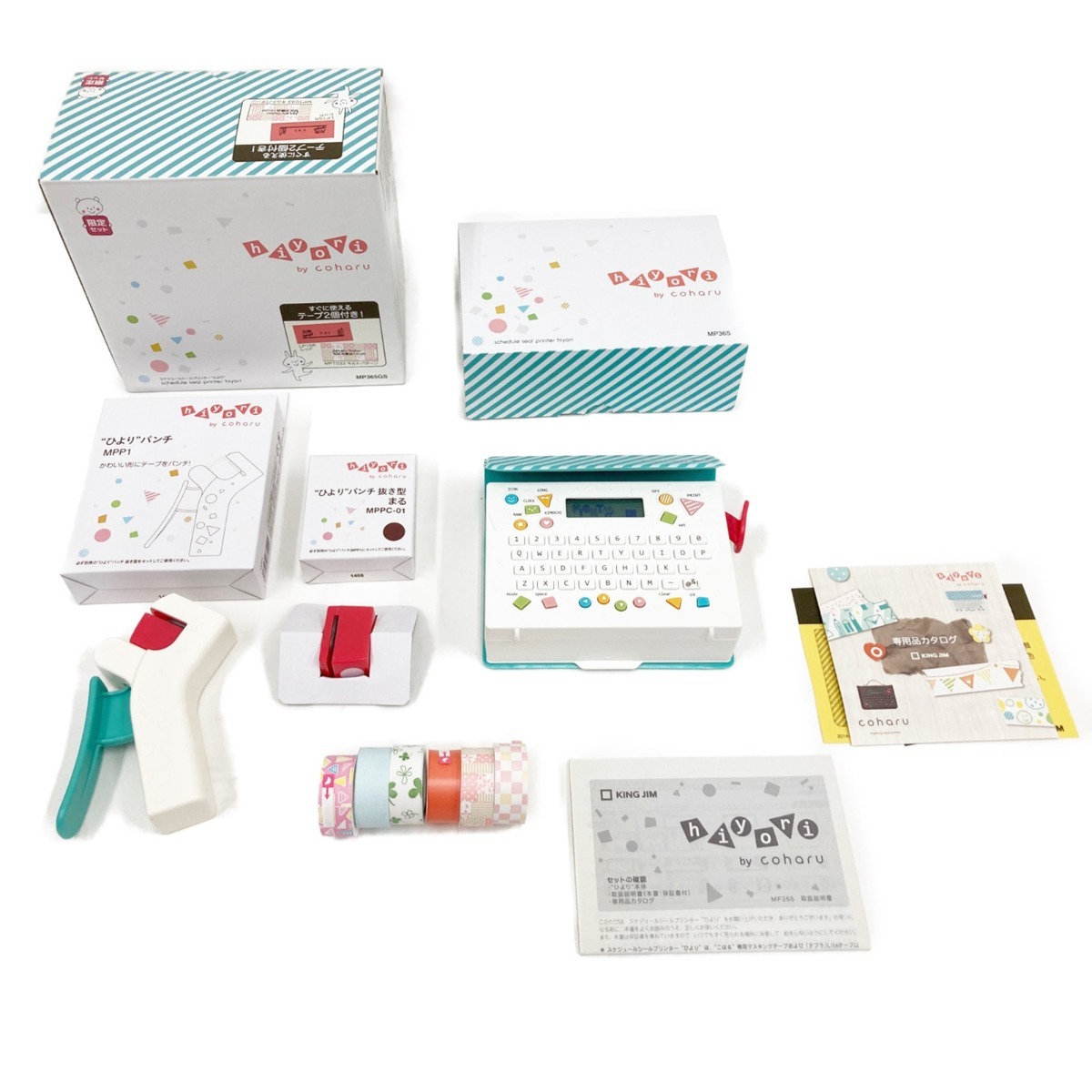 【付属品】外箱・取扱説明書 ひよりパンチ本体×1 型×2(型の種類:ハート・まる)・こはるマスキングテープ×6(本体装着含む)・テプラライトテープ×1