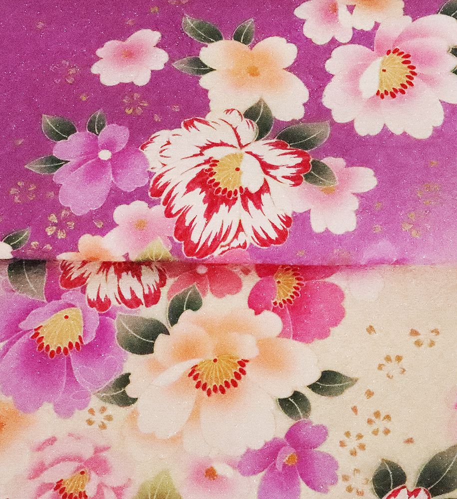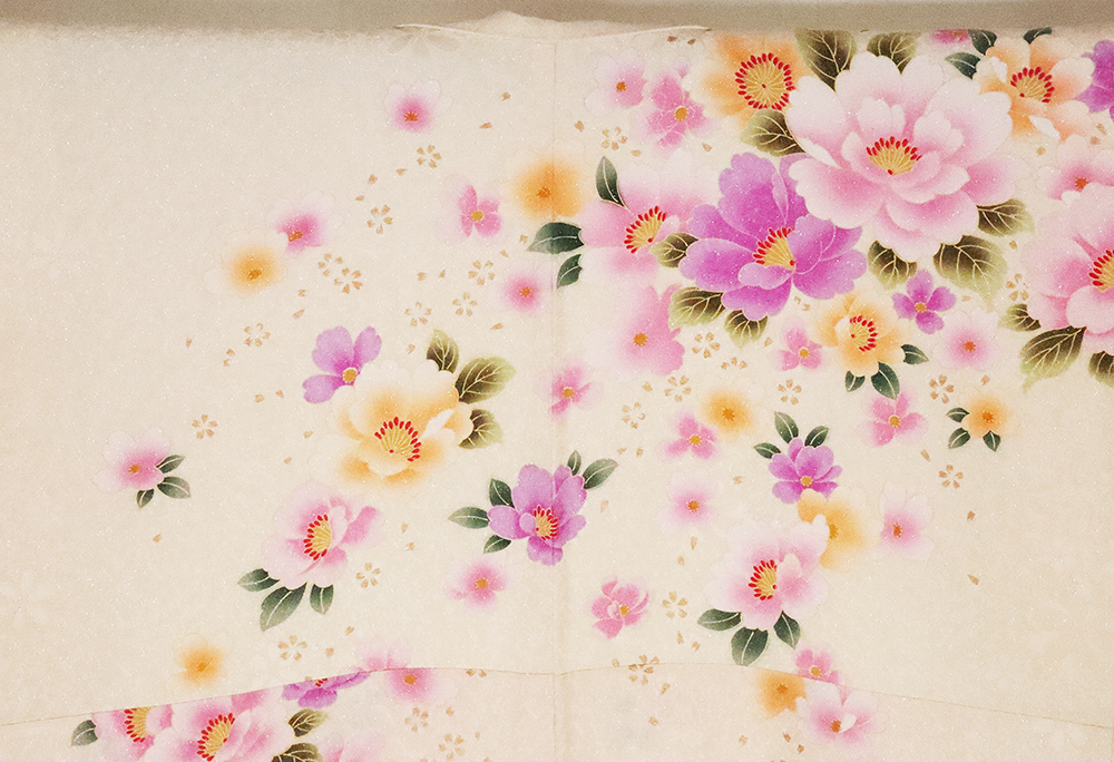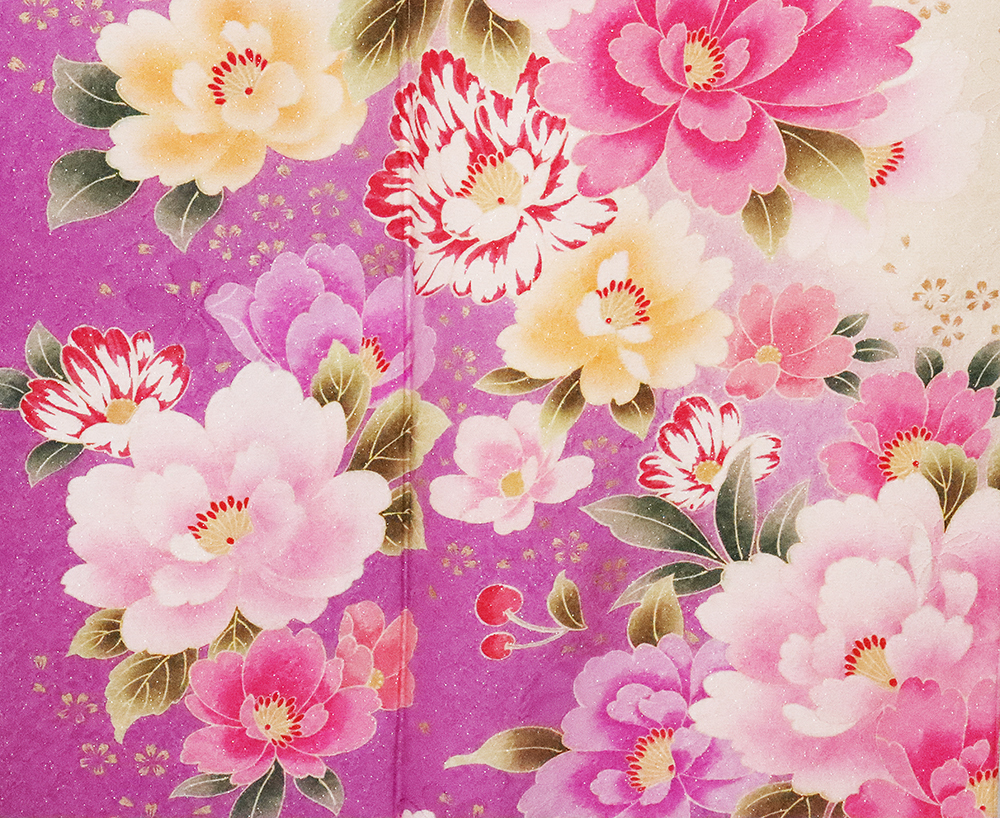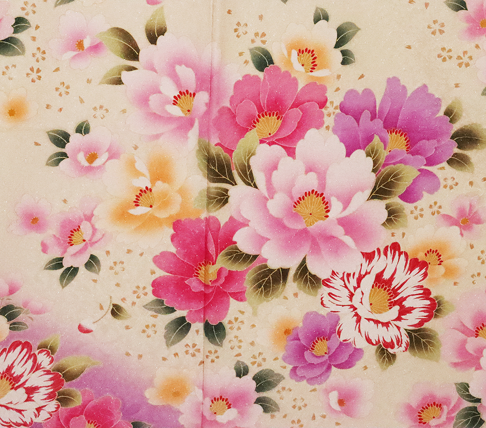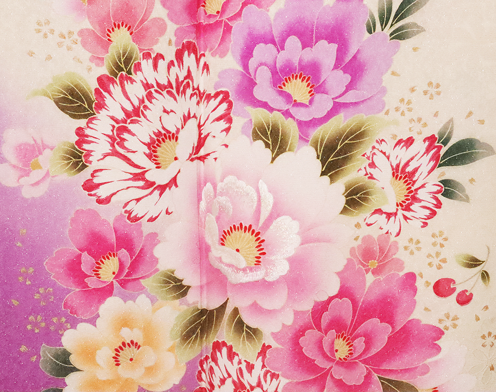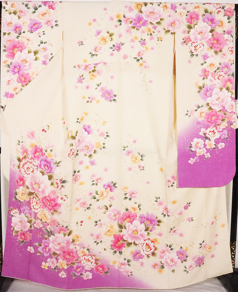 色・柄 | 振袖 袷 丹後縮緬地 クリーム・紫ぼかし・花地模様地・銀糸通し地 牡丹・桜 (写真では上手く色が出ない場合があります。ご了承下さい) 写真の枚数が多いので一度パソコンでご覧ください。 |