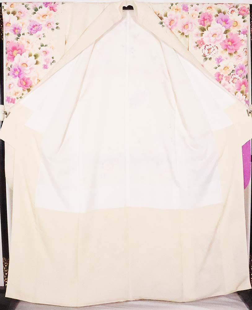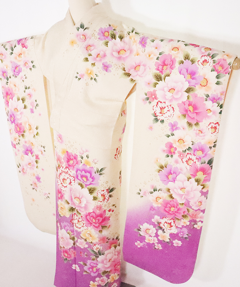 振袖 袷 丹後縮緬地 クリーム・紫ぼかし・花地模様地・銀糸通し地 牡丹・桜 171 広襟 | |