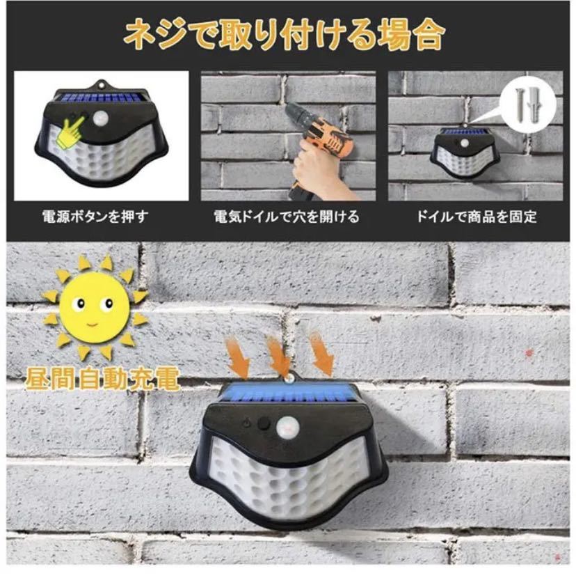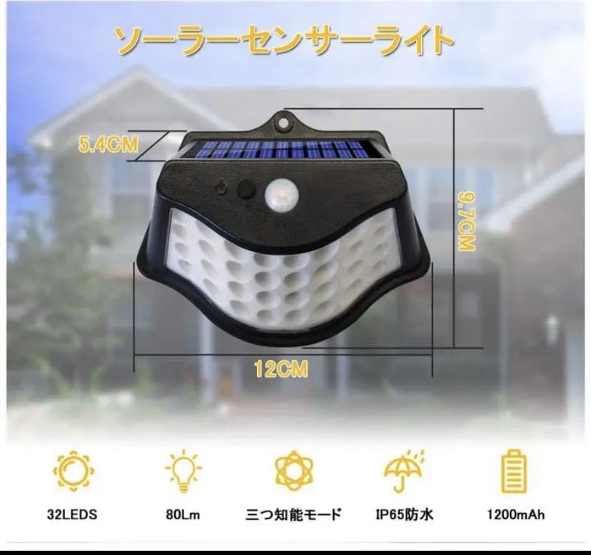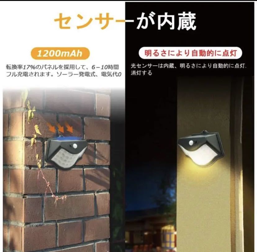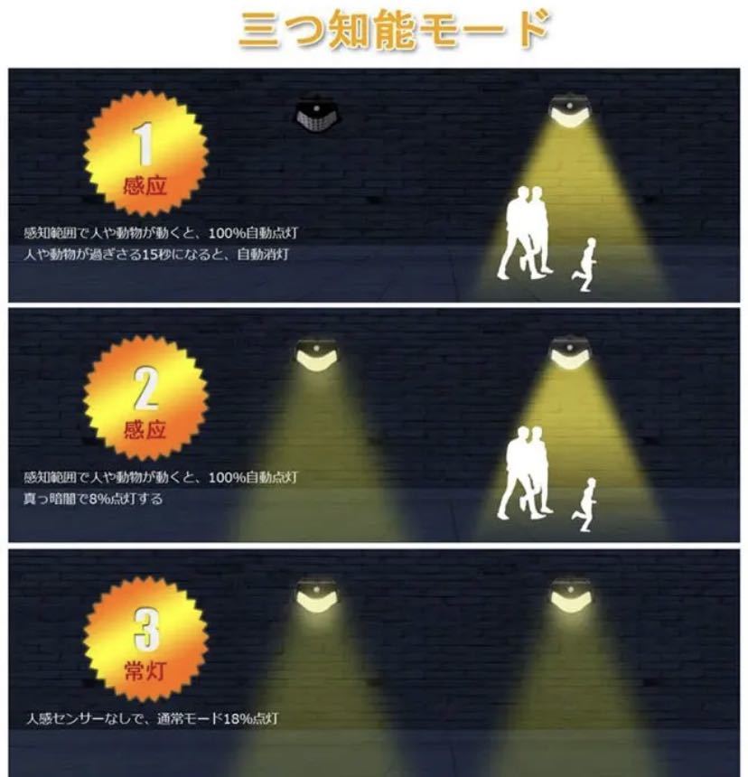 ■光センサー内臓!スイッチだけで調整ができる!【モードA】ボタンを3秒以上押してモードAである人感センサー+100%点灯モードになる。夜に感知範囲内で人や動物が動くと約15秒ライトが100%点灯します。自動的にオフになります。【モードB】ボタンを再度押してモードBである人感センサー+100%点灯モードになる。夜に感知範囲内で人や動物が動くと約15秒ライトが100%点灯します。真暗闇で8%常灯点灯します。【モードC】ボタンを再度押してモードCである常灯になる、センサーオフ。8%点灯します。