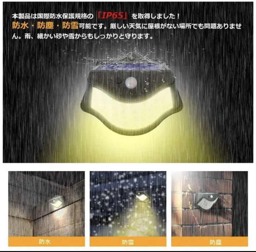■完全防水!IP65防水タイプなので、雨が降っても大丈夫です。ただし、雨の日や曇りの日で太陽光が少ないので、ライトの点灯時間が短くなります。ソーラーパネルの表面は強化ガラスなので、傷がつきにくく、長く持ちます。