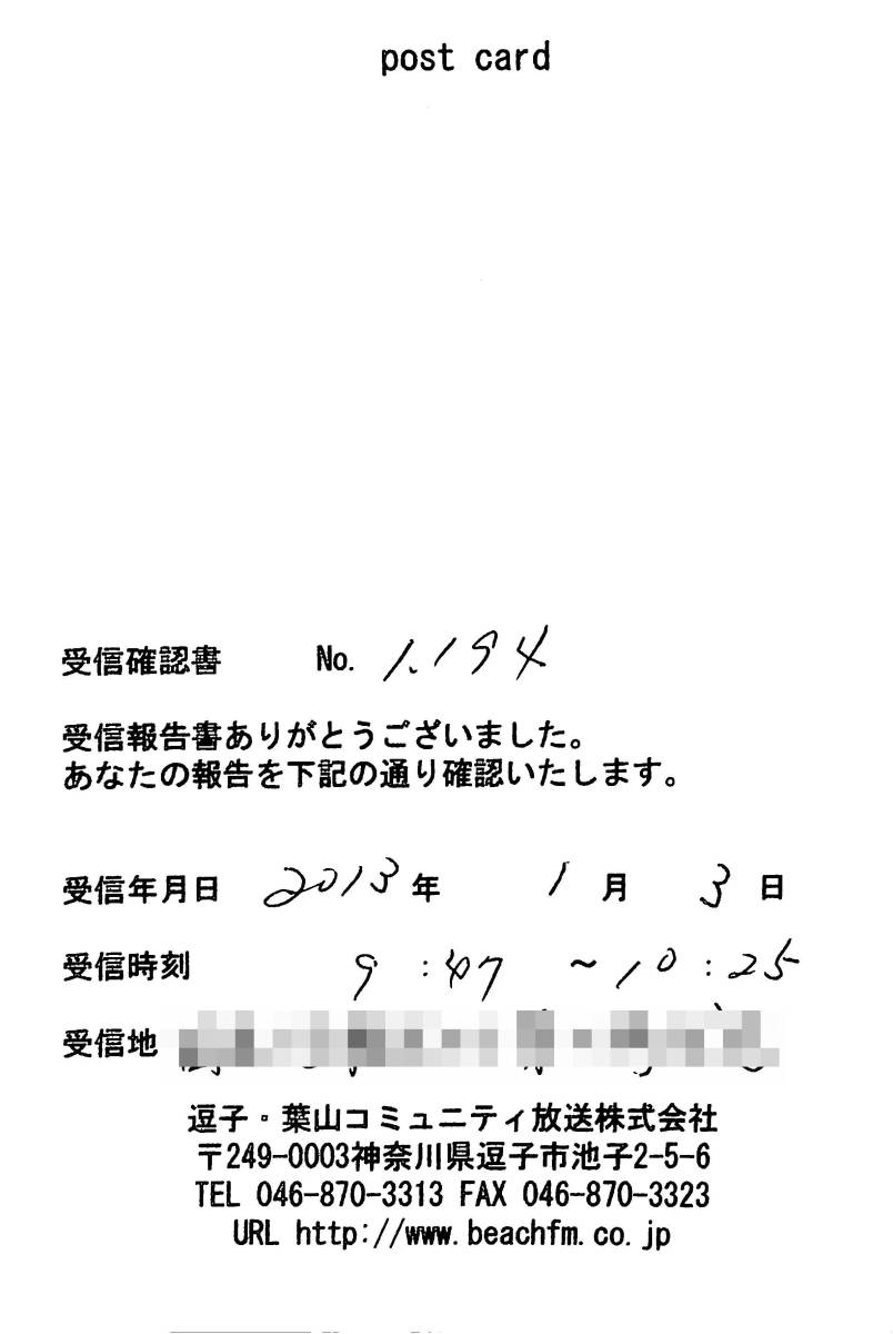 【商品名】・・・JOZZ3AB-FM(★ずしはやまFM)のベリカード。 【国名・地名】・・・日本★神奈川県三浦郡葉山町。 【受信データ】・・・2013年1月3日・FM78.9MHZを受信。 【記載事項】・・・受信データのみ記載。(★氏名を砂消しゴムで消去しています) 【状態】・・・シワ、汚れ、シミ、焼け、ハゲ、色あせ等があります。 ■カードの状態は★画像を参考に判断して下さい。 ■この機会にぜひこのベリカードを貴方のBCLコレクションに加えて下さい! | |