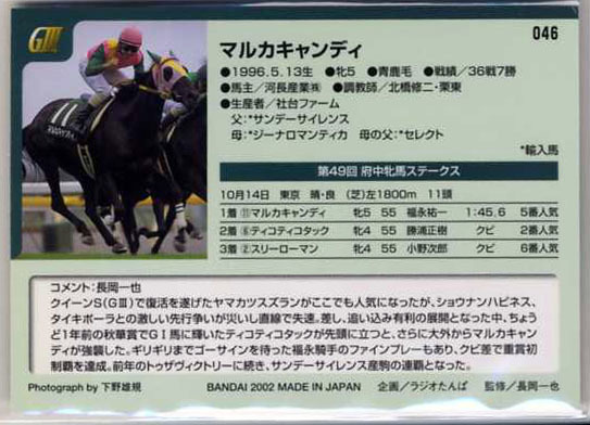| ★サラブレッドカード2001年下半期版 パラレル 箔押し金文字サイン 046 マルカキャンディ 第49回府中牝馬ステークス 福永祐一 写真 画像 競馬カード 即決 | |