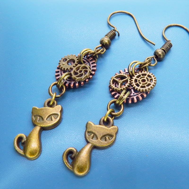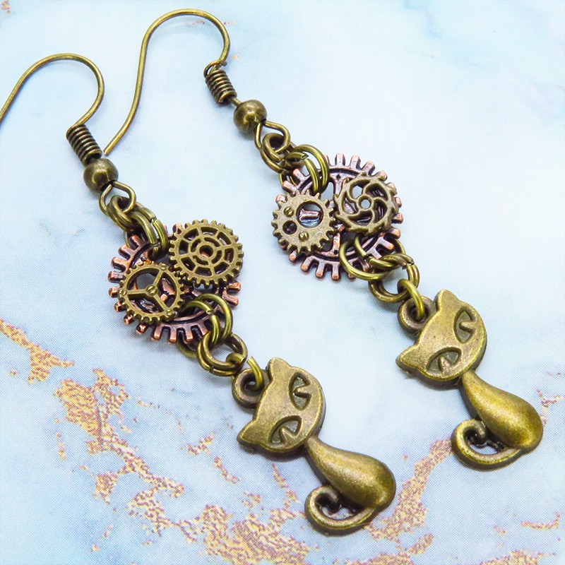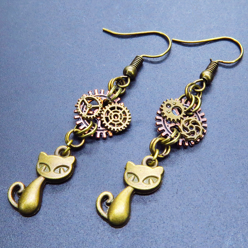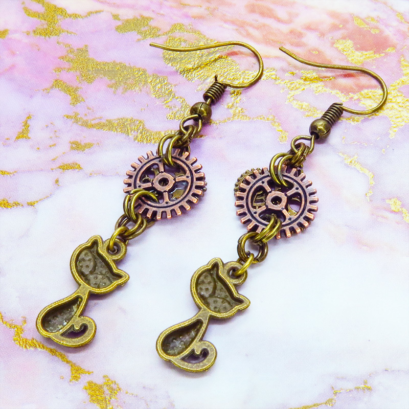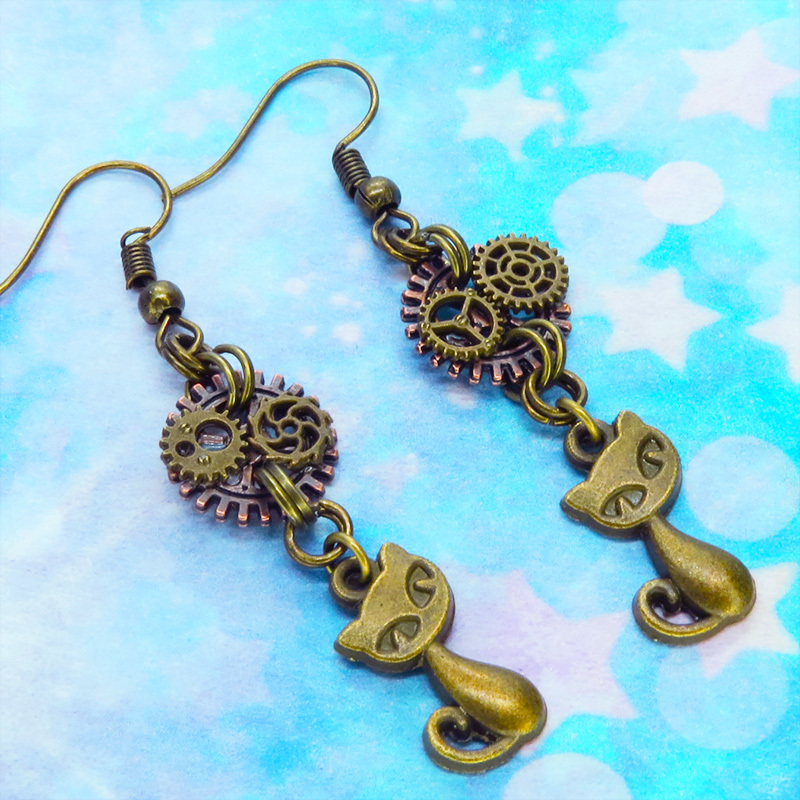 アンティークゴールドの猫と歯車のモチーフを組み合わせたスチームパンク風ピアスです