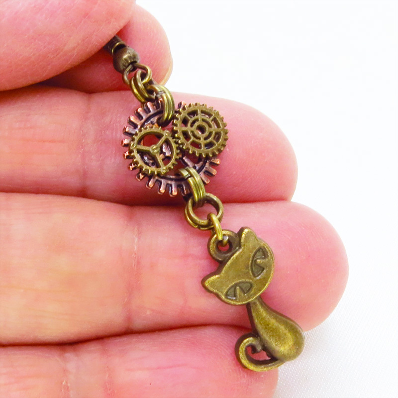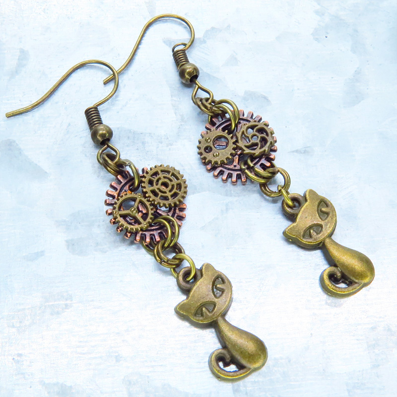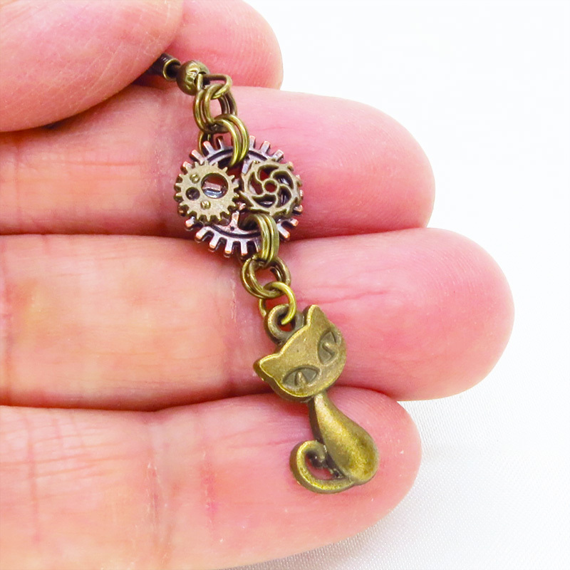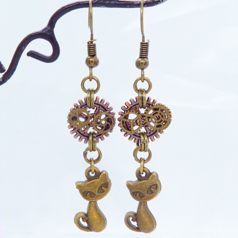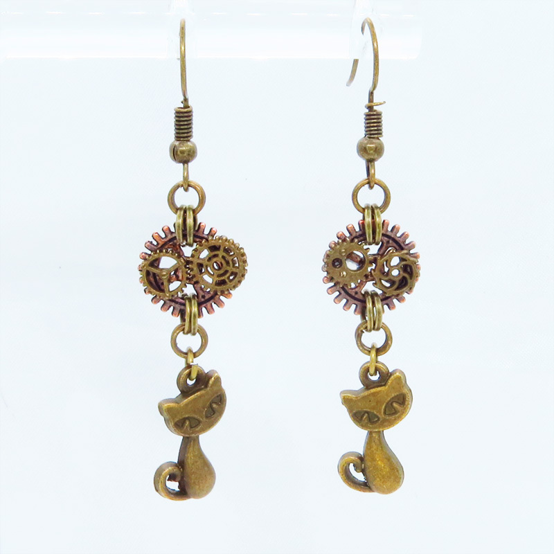 アンティークゴールドの猫と歯車のモチーフを組み合わせたスチームパンク風ピアスです